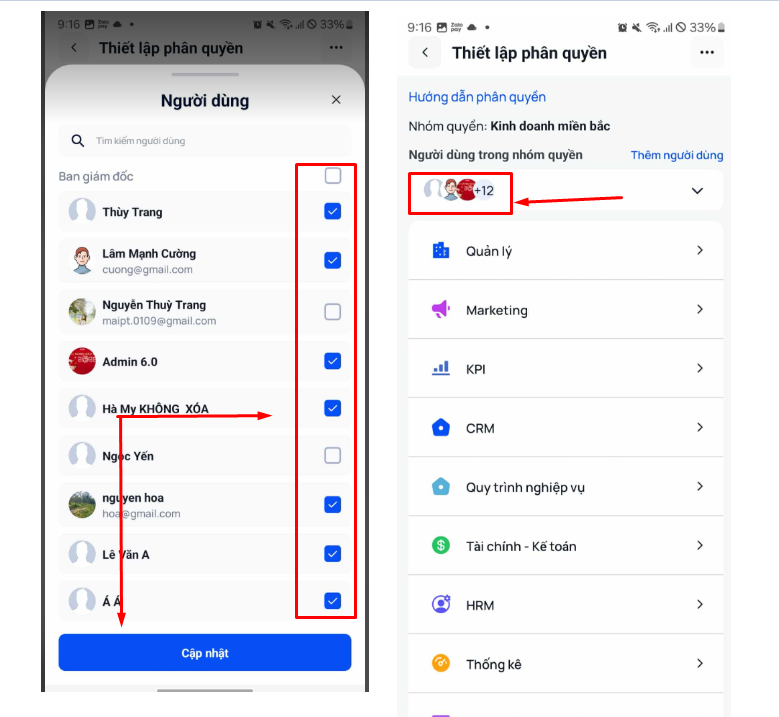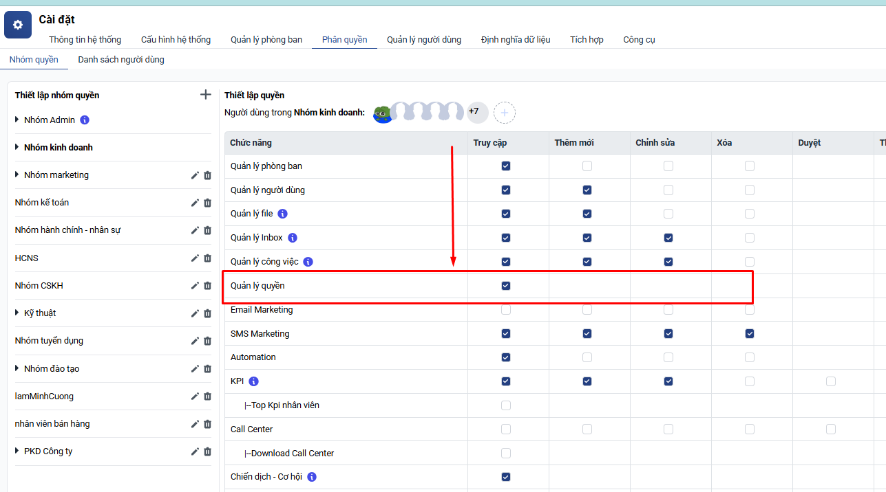 Bạn tích chọn các người dùng muốn thêm vào nhóm quyền, hoặc bỏ tích để loại bỏ người dùng khỏi nhóm quyền.