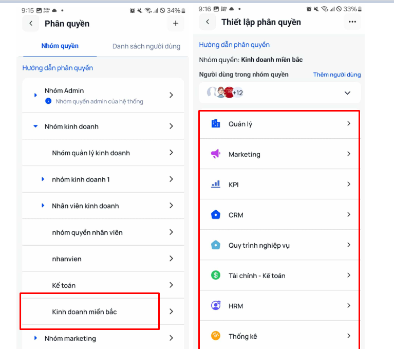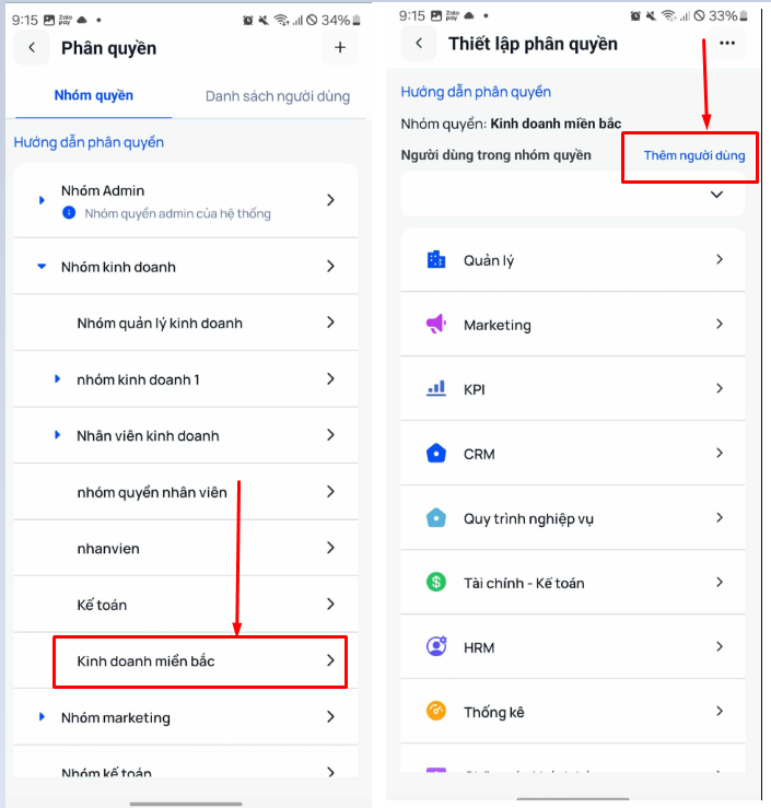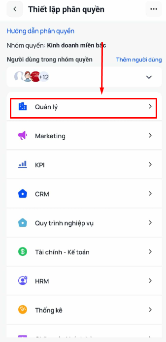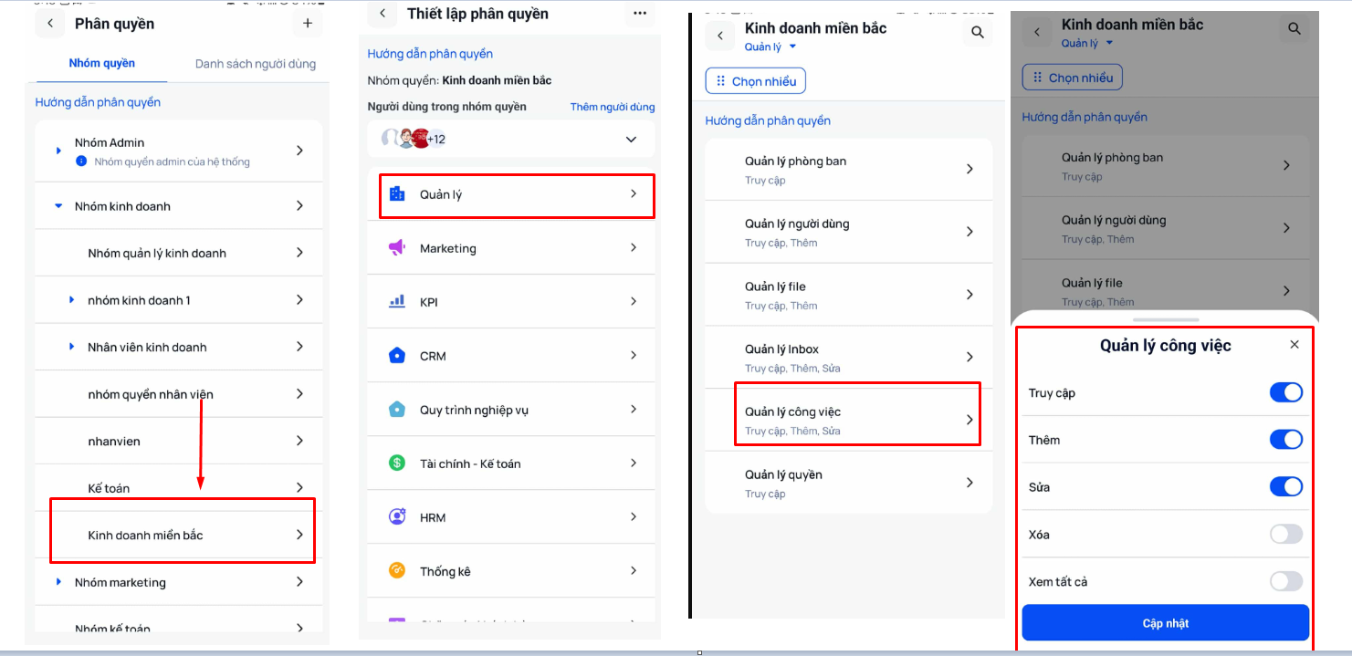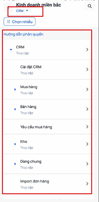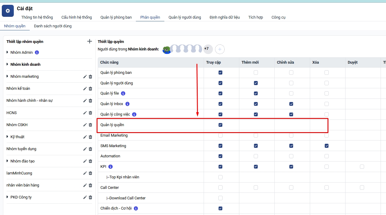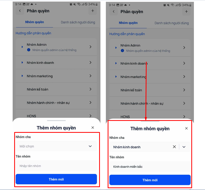 Tên nhóm quyền: Nhập tên nhóm quyền bạn muốn tạo, ví dụ: Kinh doanh miền Bắc.