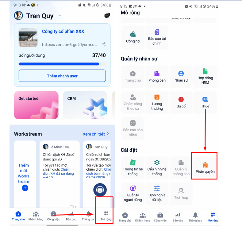 Bước 1: Tại màn hình Trang chủ, bạn chọn Mở rộng, sau đó chọn Phân quyền để truy cập tính năng phân quyền trên app.