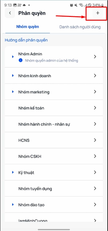 Bước 2: Màn hình Thiết lập quyền sẽ hiển thị danh sách các nhóm quyền đã được tạo trước đó. Bạn nhấn vào biểu tượng dấu “+” ở góc phải màn hình để thêm nhóm quyền mới.