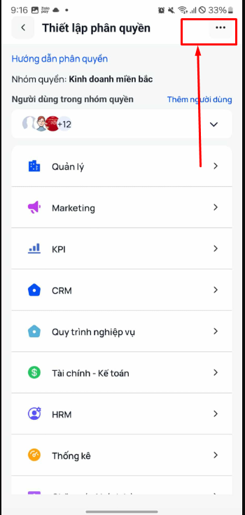 Tại màn hình Chi tiết nhóm quyền, bạn nhấn vào biểu tượng ba chấm (….) ở góc phải.
