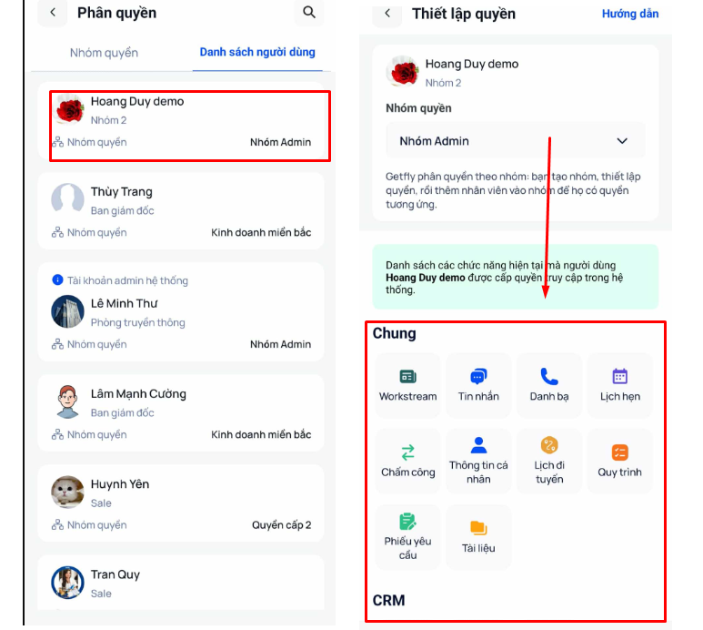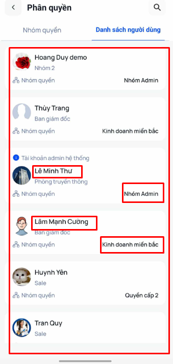 Màn hình sẽ hiển thị danh sách người dùng cùng nhóm quyền tương ứng.