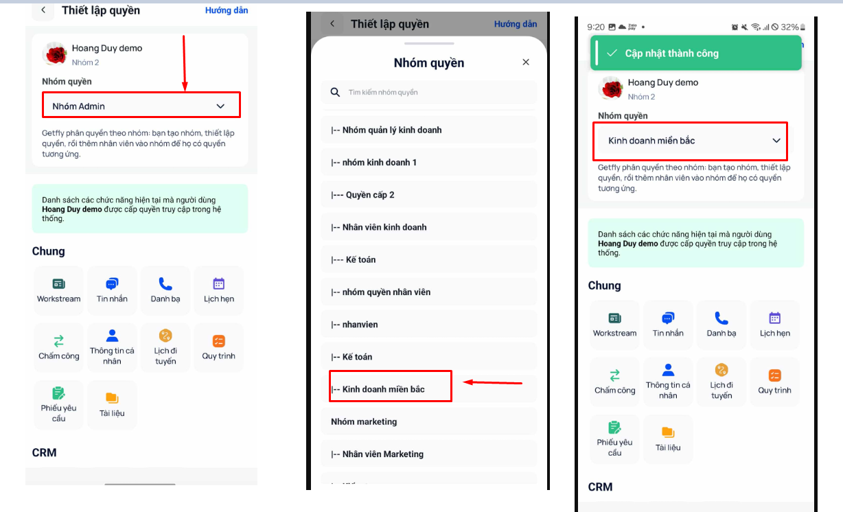 hoặc cập nhật nhóm quyền của người dùng sang nhóm quyền khác.