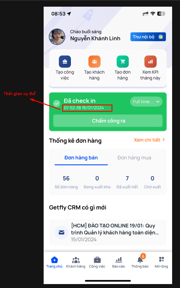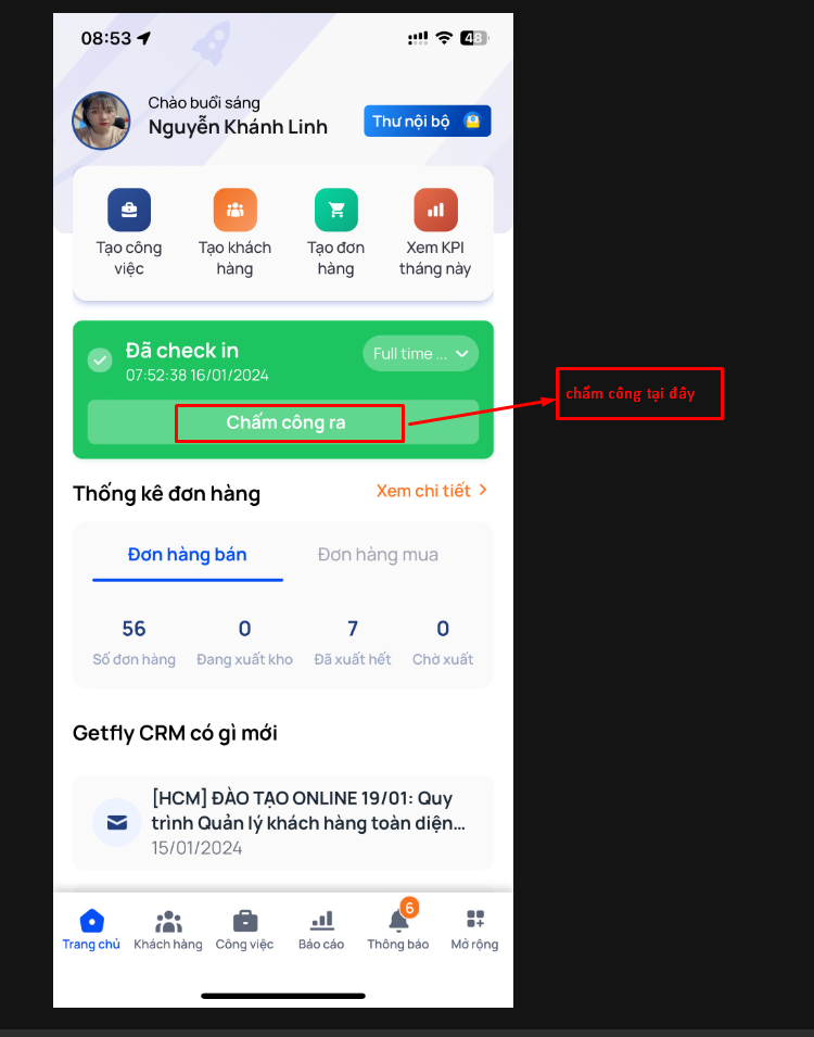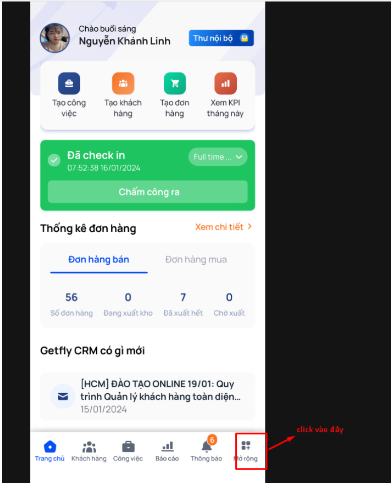 Truy cập màn hình trang chủ trên app Getfly hiển thị phần chấm công