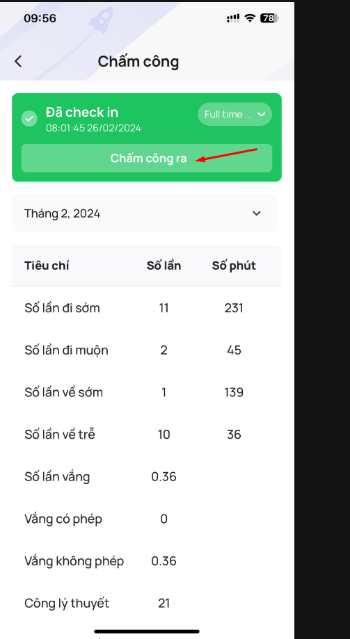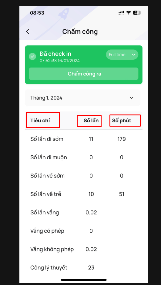 Bạn sẽ có thể xem được thông tin chi tiết về việc chấm công của mình, bao gồm: