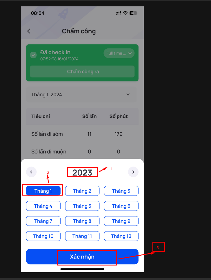Màn hình hiển thị phần chấm công