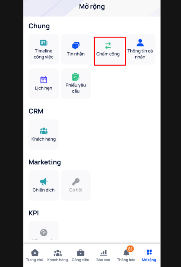 Click vào phần Mở rộng -> chọn Chấm công
