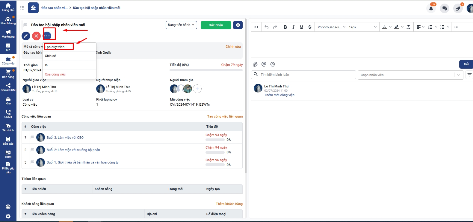 Hiện tại, Getfly chưa có tính năng sao chép công việc trực tiếp. Tuy nhiên, bạn có thể sử dụng tính năng quy trình mẫu công việc để tạo các công việc lặp lại một cách nhanh chóng và hiệu quả. Dưới đây là hướng dẫn chi tiết: