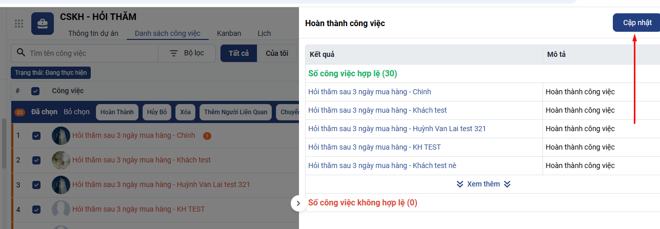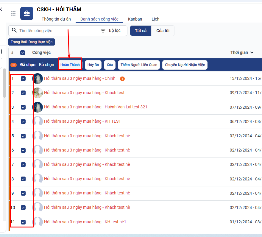 Câu 8. Làm thế nào để hoàn thành hàng loạt nhiều công việc trên Getfly?