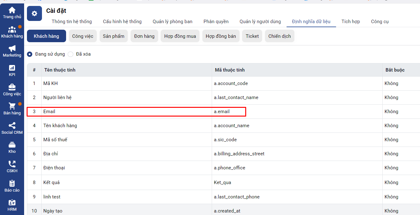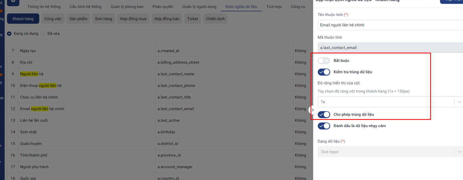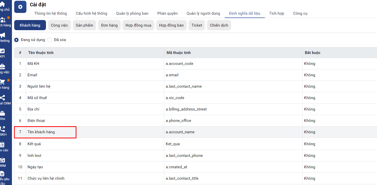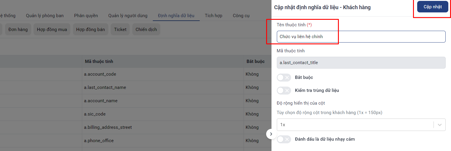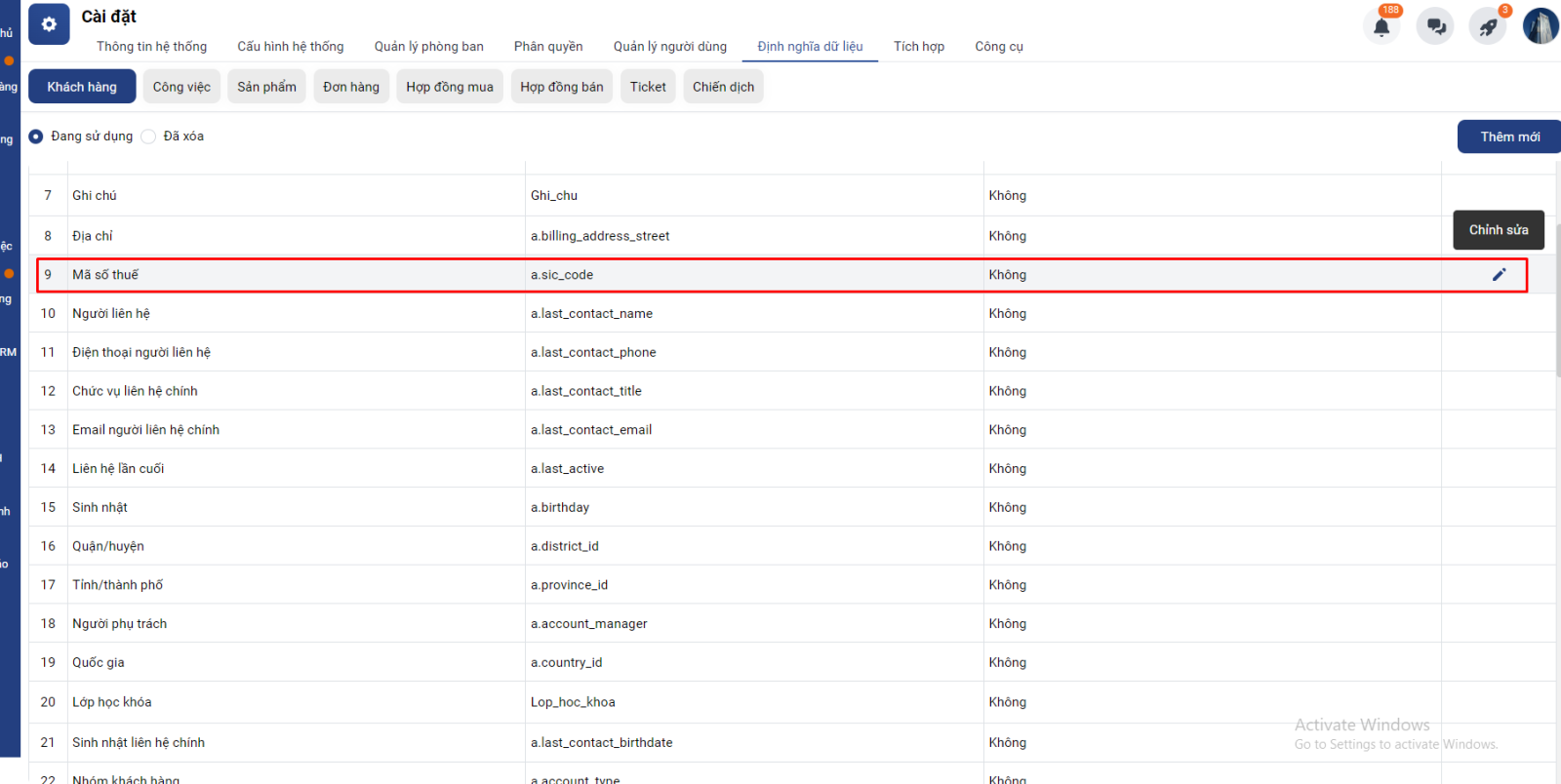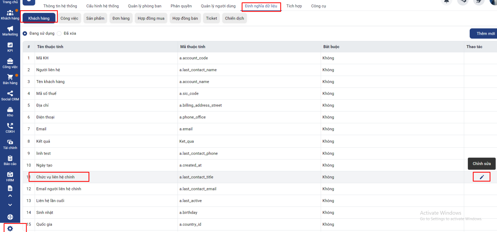 - Hoặc bạn có thể sửa tên thuộc tính các trường dữ liệu người liên hệ bằng các vào cài đặt => định nghĩa dữ liệu => khách hàng => ấn vào bút chỉnh sửa để sửa tên thuộc tính này: