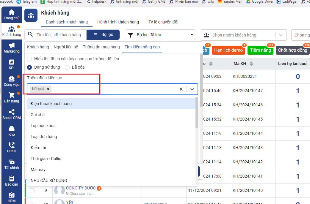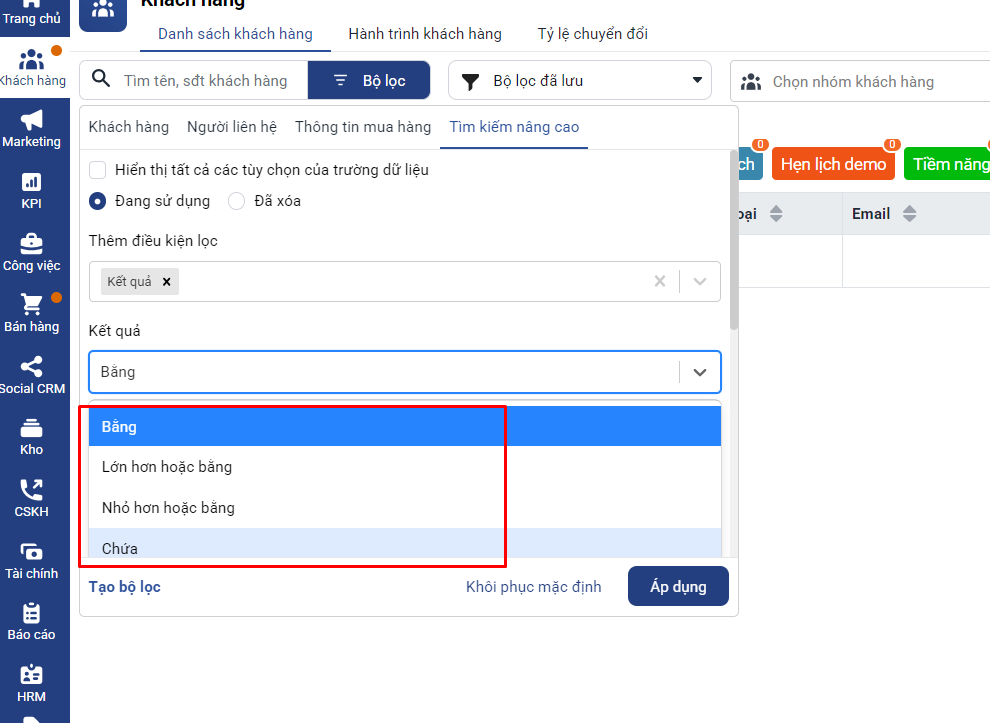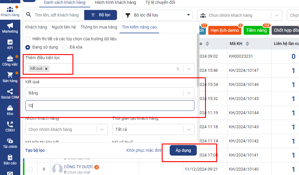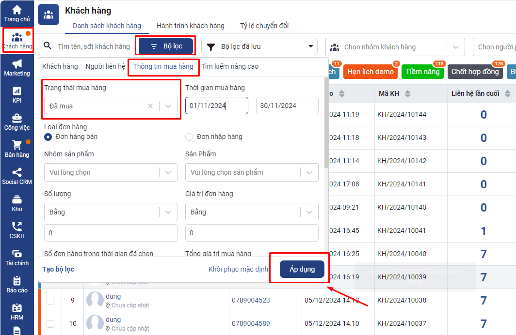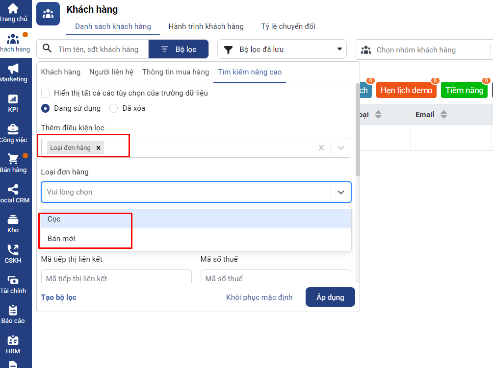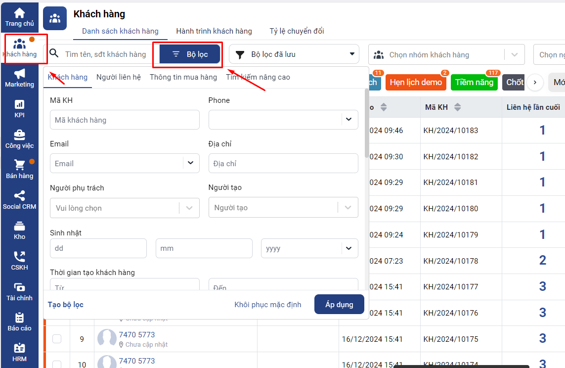 1. Vào mục khách hàng => chọn phần bộ lọc
