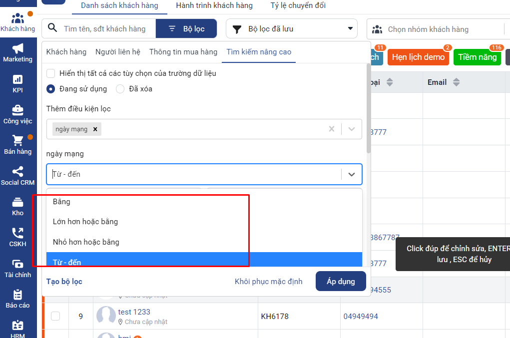 Để lọc các trường dữ liệu tự tạo trên mục khách hàng bạn thao tác theo hướng dẫn sau: