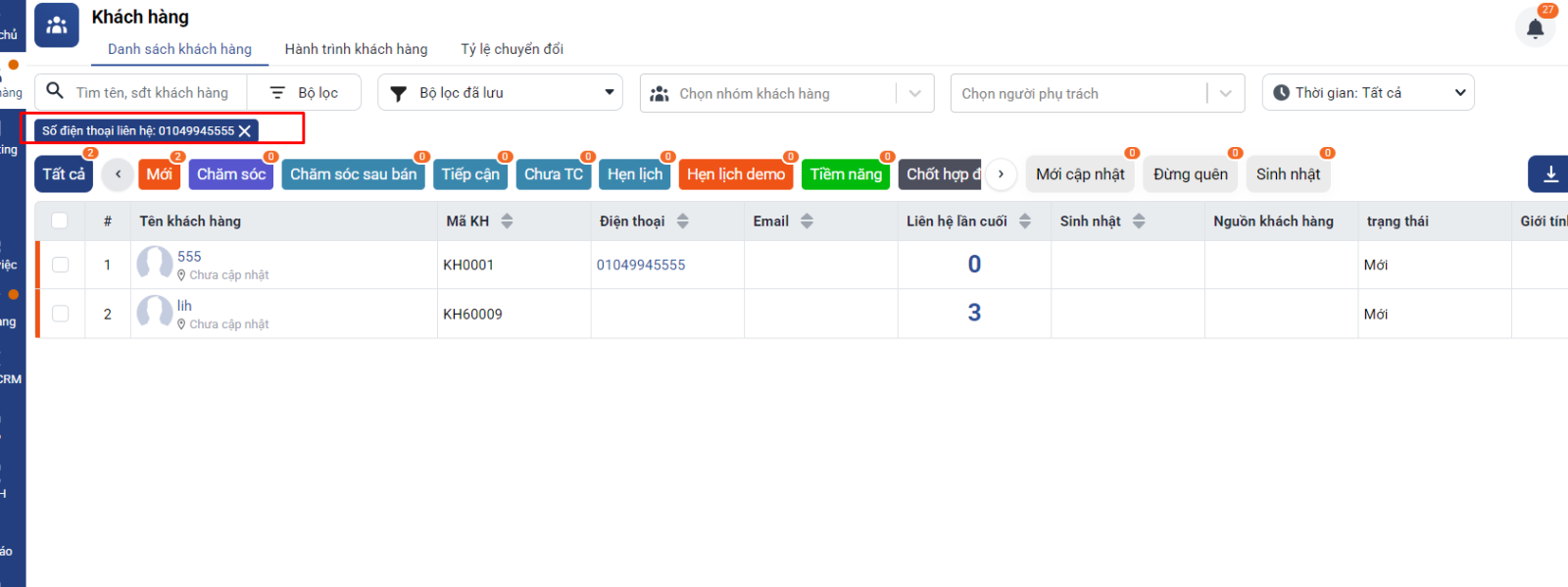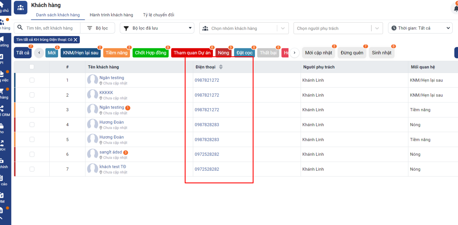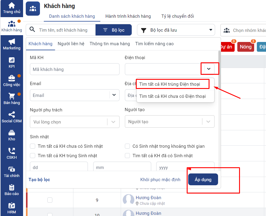 Để lọc những data khách hàng trùng số điện thoại trên hệ thống các bạn thao tác theo hướng dẫn sau: