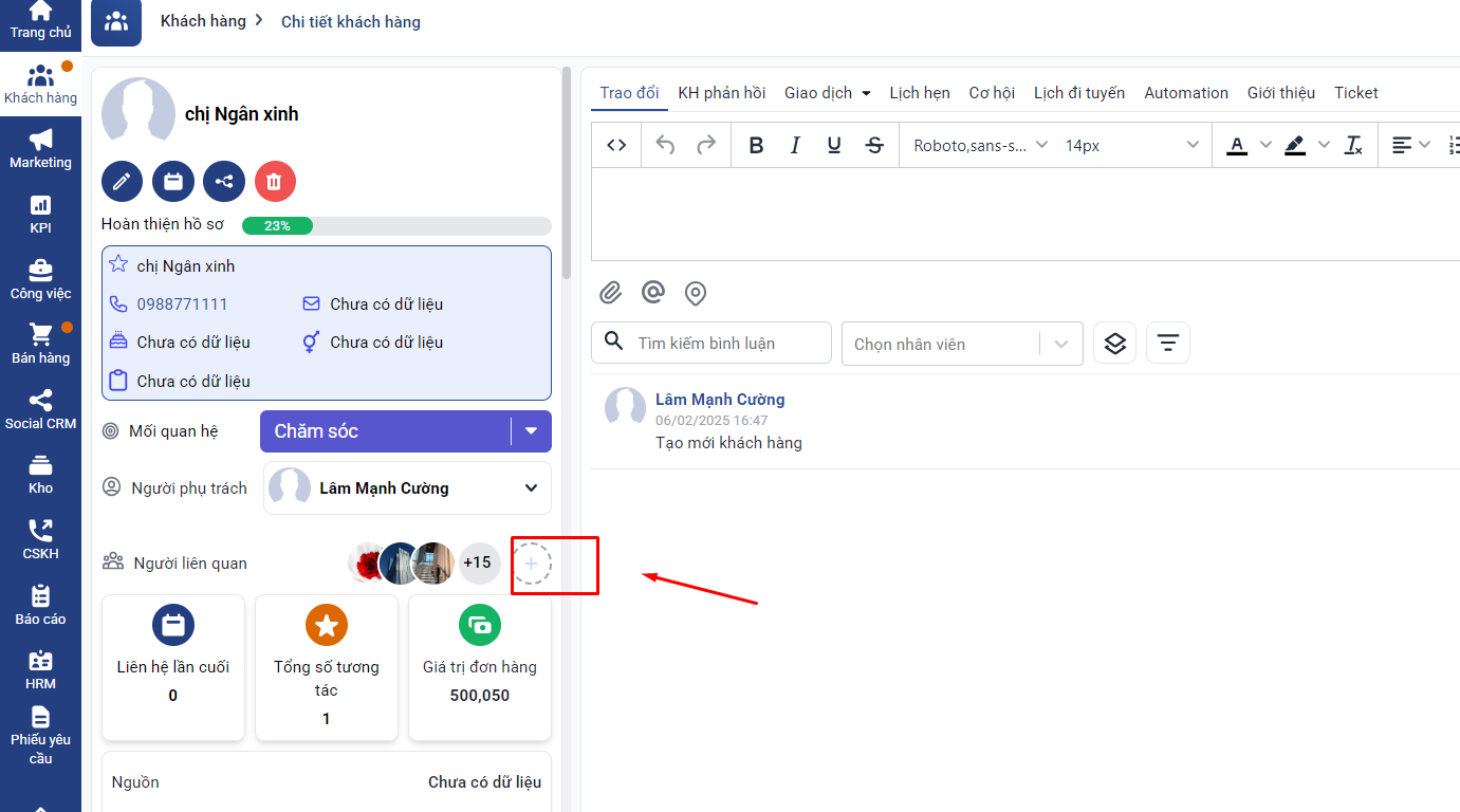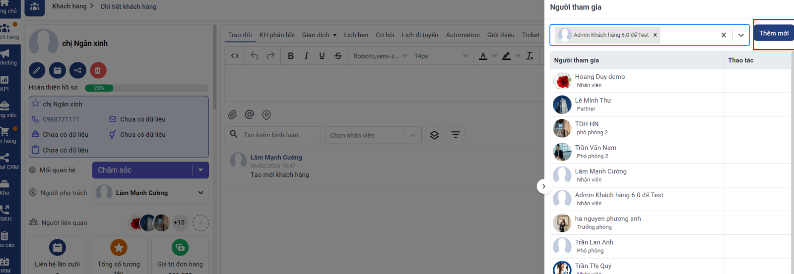 - Bạn click vào từng khách hàng và ấn thêm người xem ở mục người liên quan => chọn tài khoản để thêm người xem khách hàng => thêm mới
