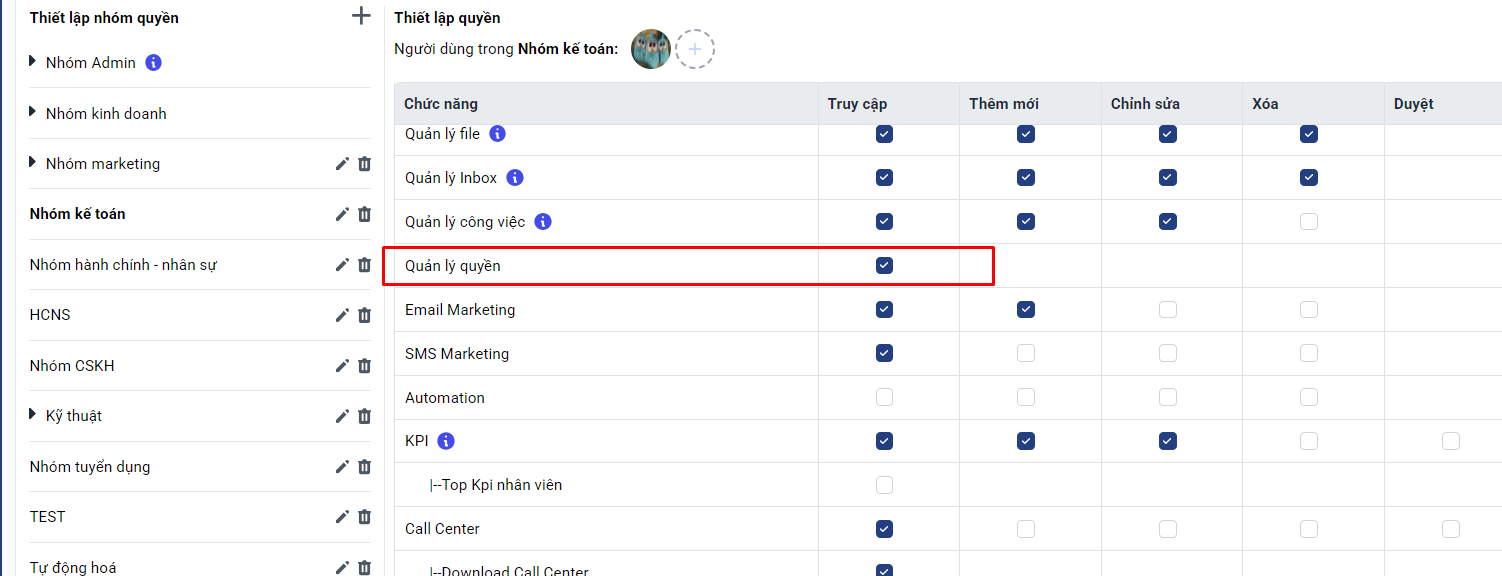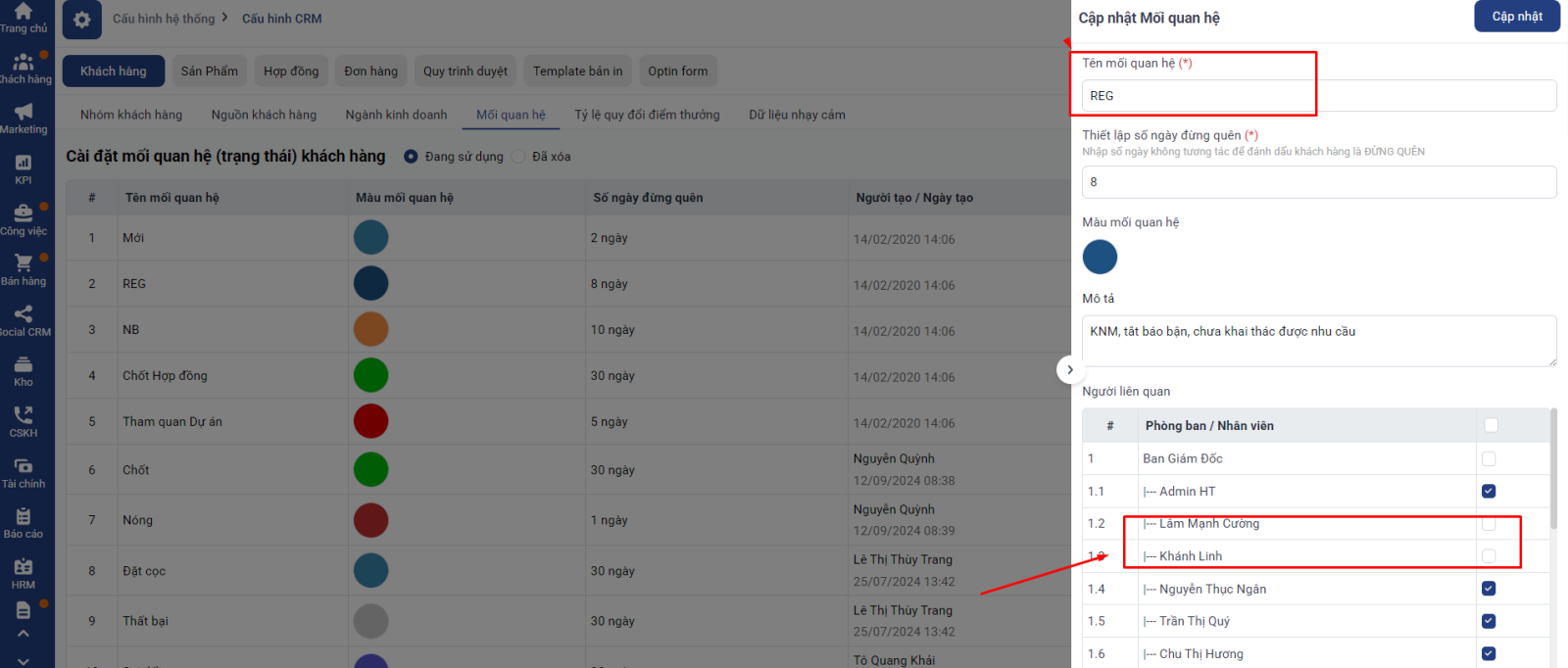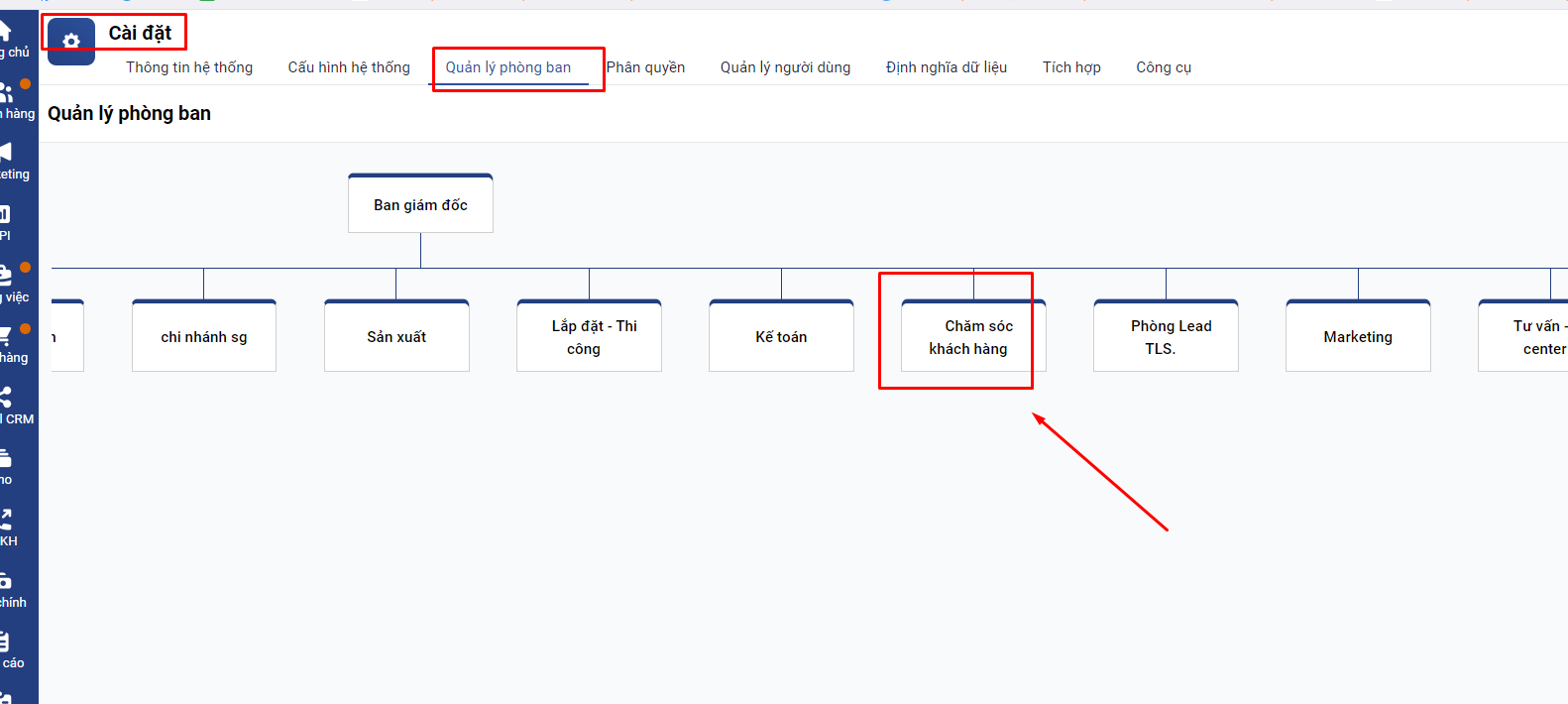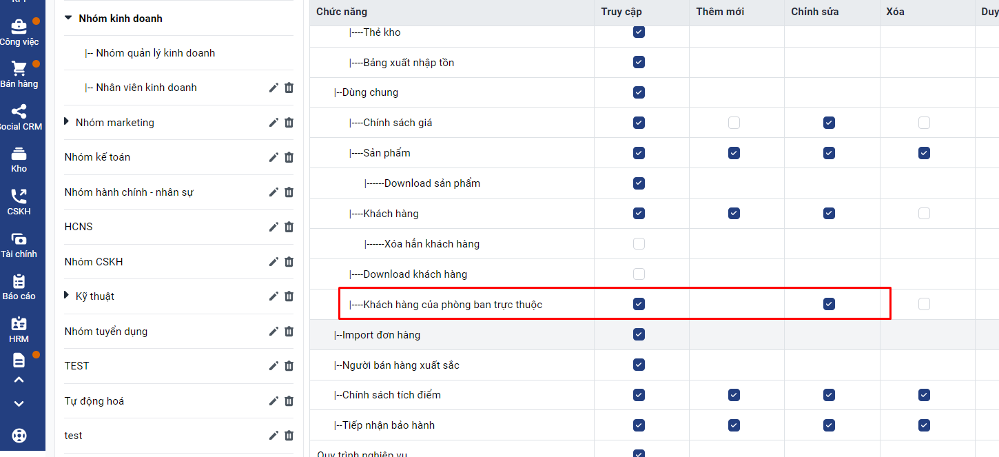 - Bạn có thể thiết kế theo team những tài khoản có thể xem, sửa được khách hàng của nhau vào một team trong mục quản lý phòng ban và tích quyền truy cập, sửa khách hàng phòng ban trực thuộc