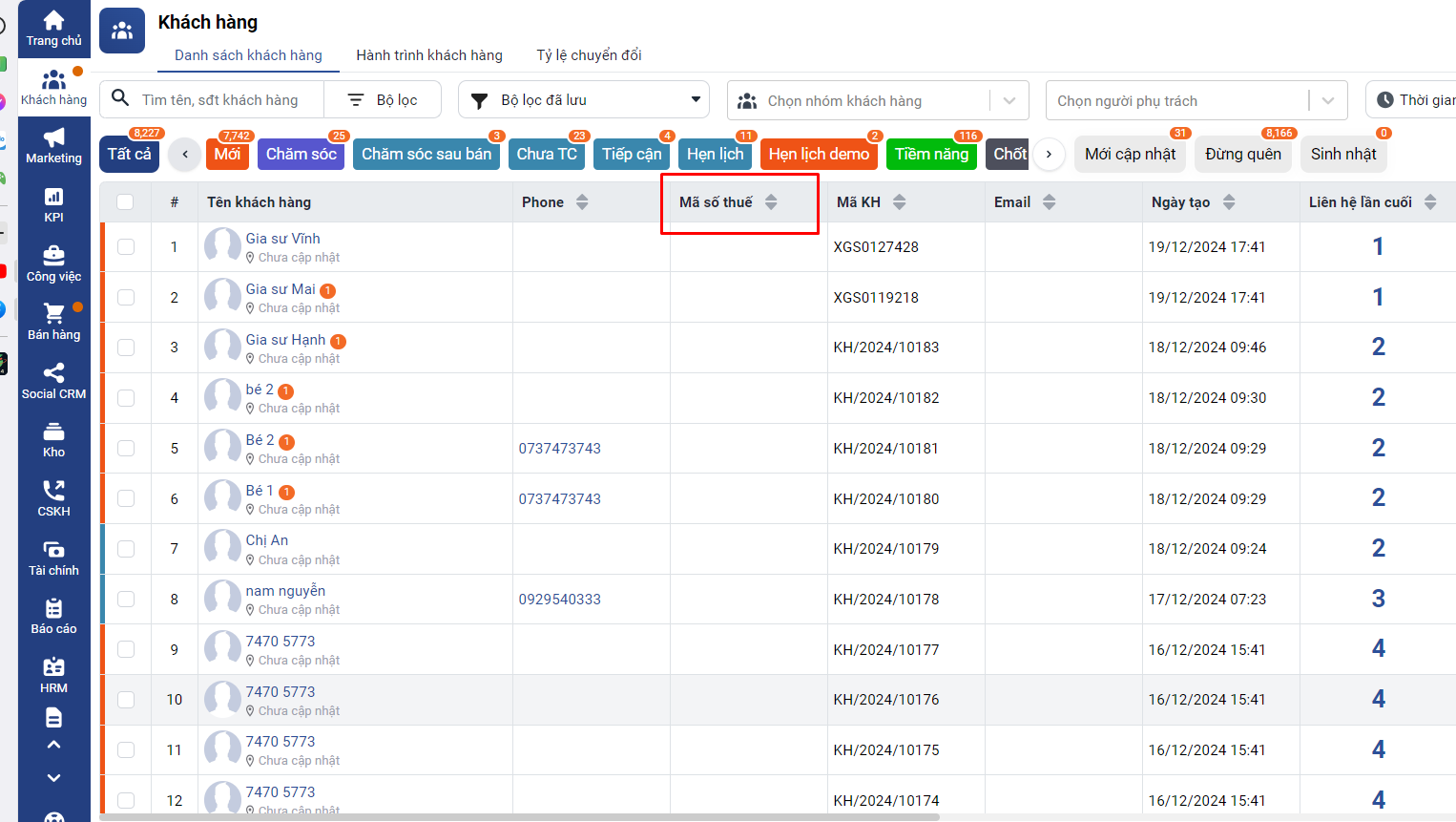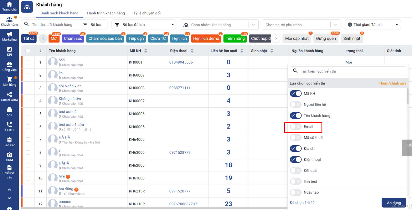 + Thứ tự sắp xếp các cột còn phụ thuộc vào cấu hình ẩn hiện các trường dữ liệu hiển thị trong mục quản lí khách hàng theo từng tài khoản