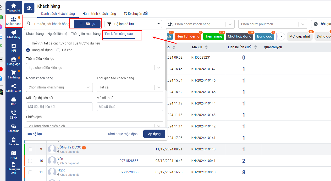 Bước 1: Bạn vào mục khách hàng => chọn bộ lọc => nhấn vào phần tìm kiếm nâng cao: