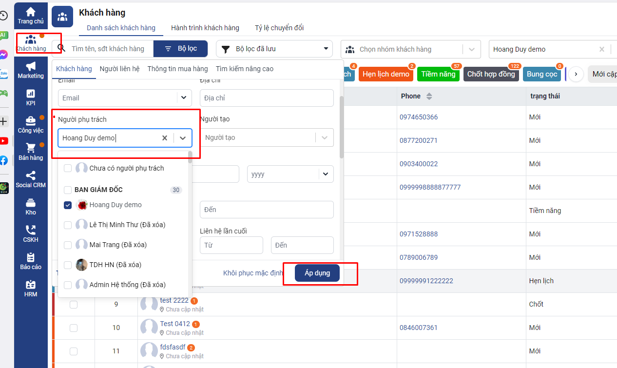 - Trường hợp này bạn vào mục bộ lọc => chọn tab người liên hệ và điền số điện thoại bạn muốn lọc xem số này có trùng với liên hệ nào trên hệ thống hay không => ấn áp dụng: