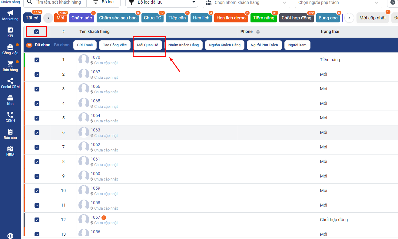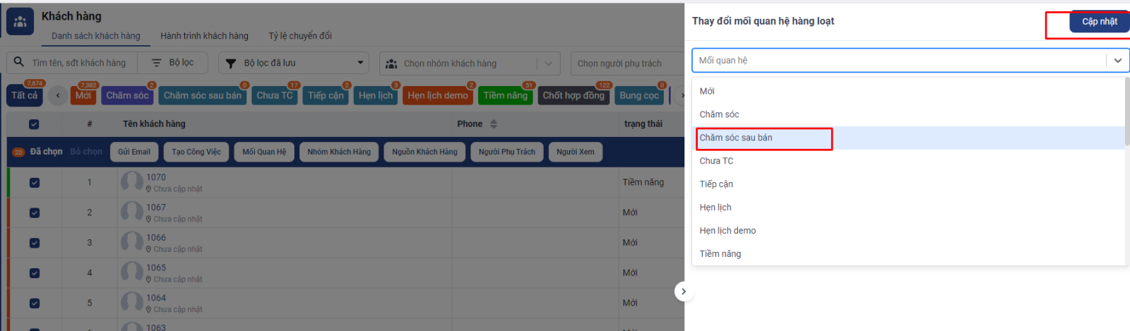 Bước 3: Thực hiện chuyển mối quan hệ hàng loạt - Tích chọn hàng loạt những khách hàng đã được tìm kiếm => Chọn mục Mối quan hệ. - Tích chọn mối quan hệ cần chuyển. - Nhấn Cập nhật để hoàn tất việc chuyển mối quan hệ.