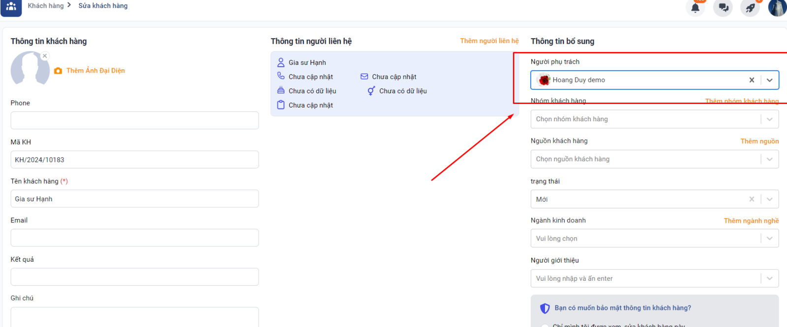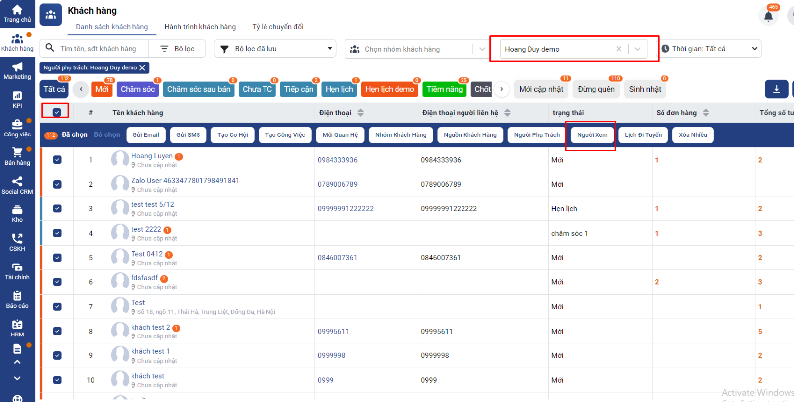 - Bạn vào mục khách hàng => lọc tất cả khách hàng theo người phụ trách mà bạn muốn những tài khoản khác có thể xem được khách hàng của tài khoản này và thêm người xem vào những khách hàng này