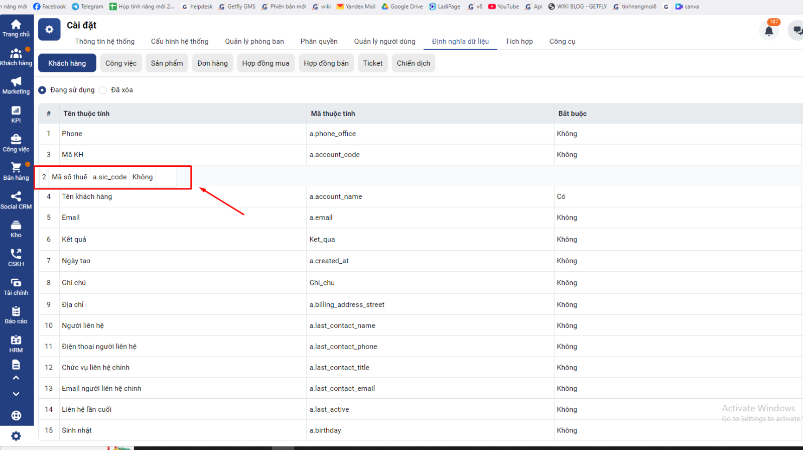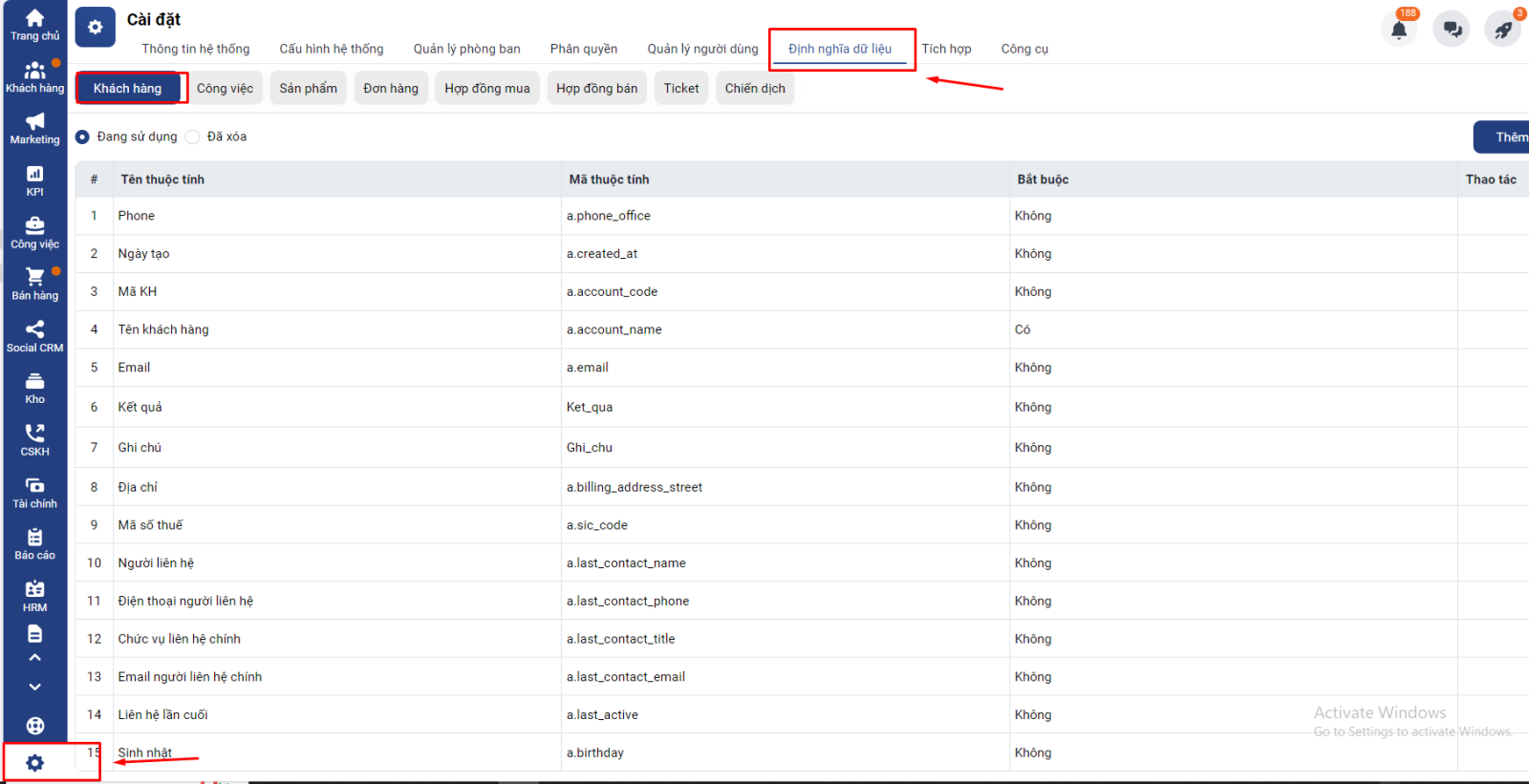 Bước 1: Các bạn vào phần cài đặt => định nghĩa dữ liệu => chọn khách hàng