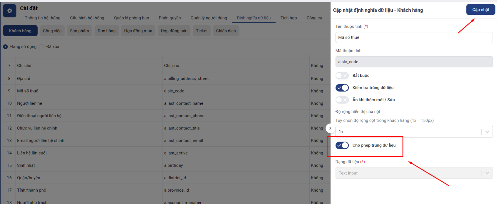 Bước 3: Tại trường thông tin này bạn bật cho phép trùng dữ liệu => ấn cập nhật
