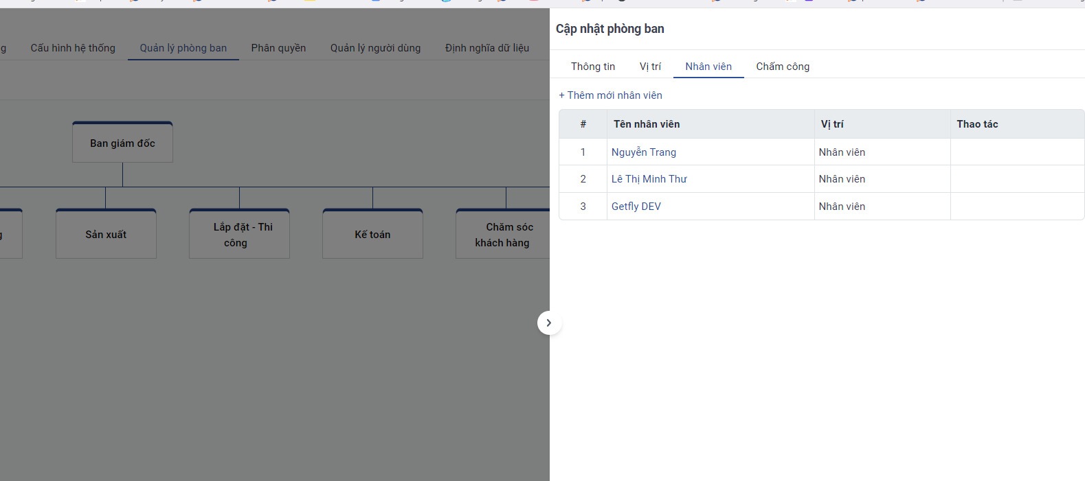 Ví dụ: Trong phòng chăm sóc khách hàng gồm các tài khoản nhân viên Nguyễn Trang, Lê Thị Minh Thư, Getfly Dev sẽ xem và sửa được khách hàng của nhau thì bạn cần phân quyền các tài khoản này truy cập và sửa khách hàng phòng ban trực thuộc