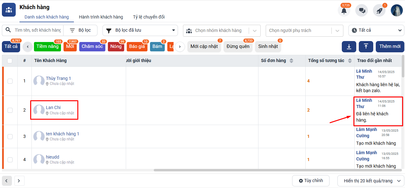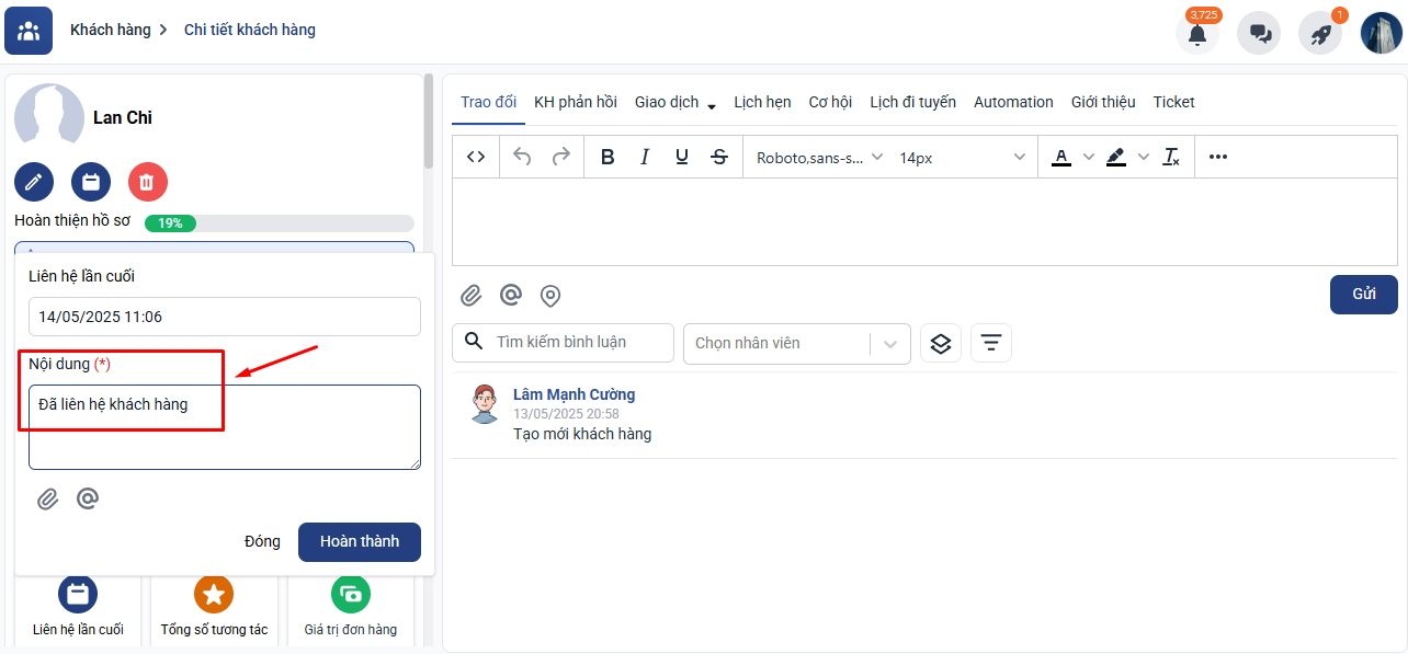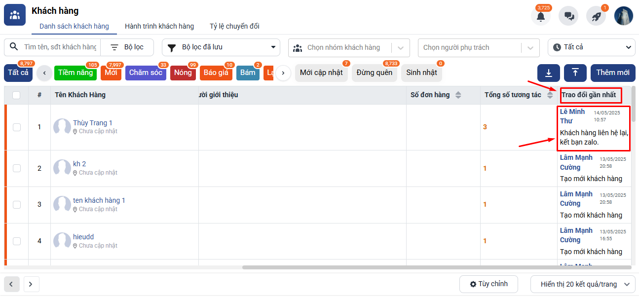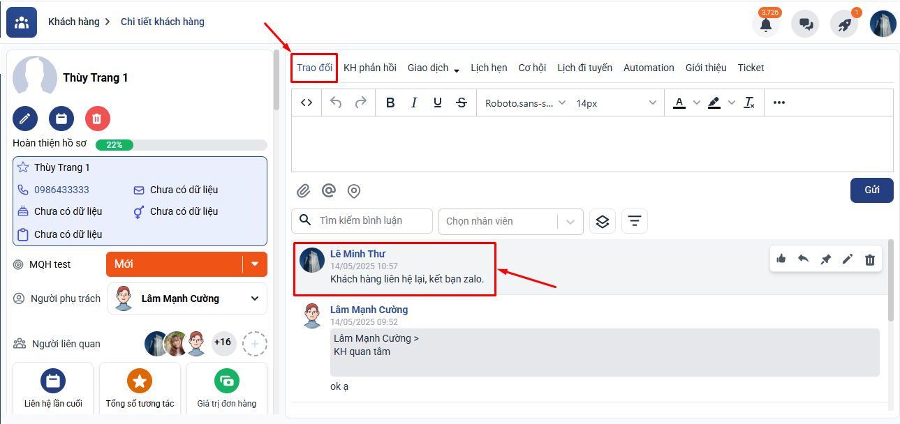 Lưu ý: Bình luận trong trao đổi khách hàng và nội dung cập nhật liên hệ lần cuối, thao tác nào gần nhất sẽ hiển thị nội dung theo thao tác đó.