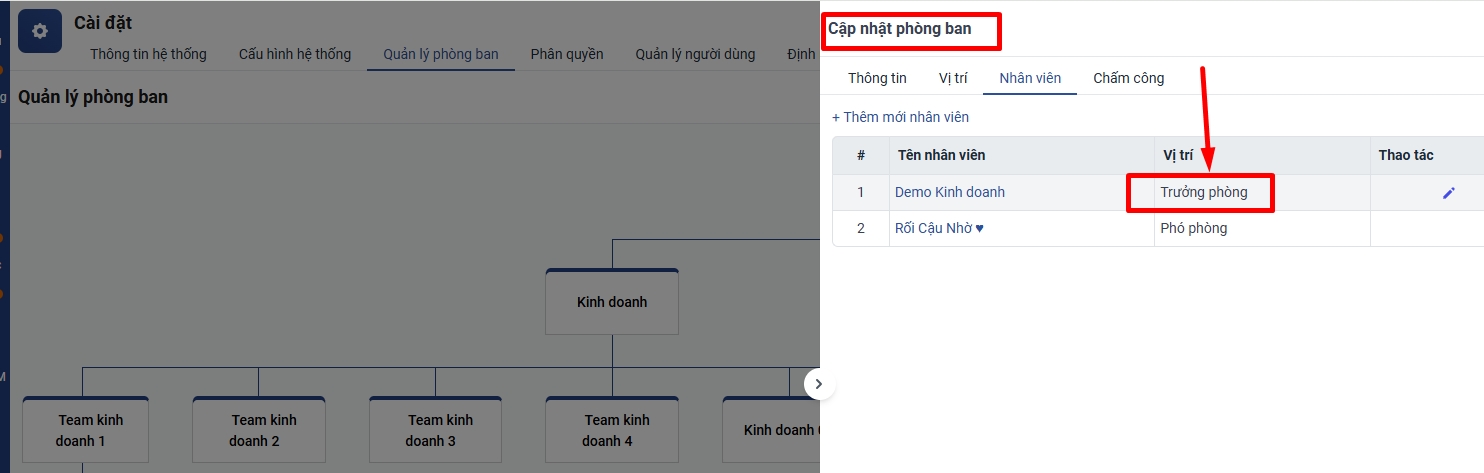 Điều chỉnh vị trí của tài khoản này giữ chức vụ Trưởng phòng trong Sơ đồ tổ chức.