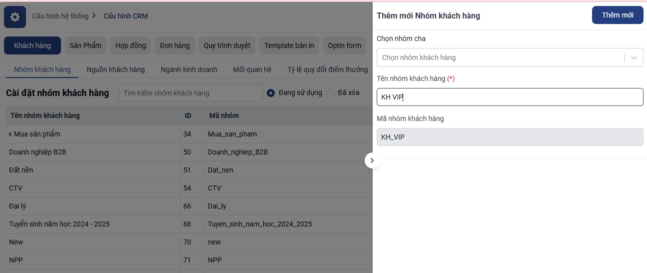 Để tạo mới nhóm nhóm khách hàng bạn truy cập Cài đặt ⇒ Cấu hình hệ thống ⇒ Cấu hình CRM ⇒ Khách hàng ⇒ Nhóm khách hàng ⇒ Thêm mới, nhập tên nhóm khách hàng và nhấn thêm mới