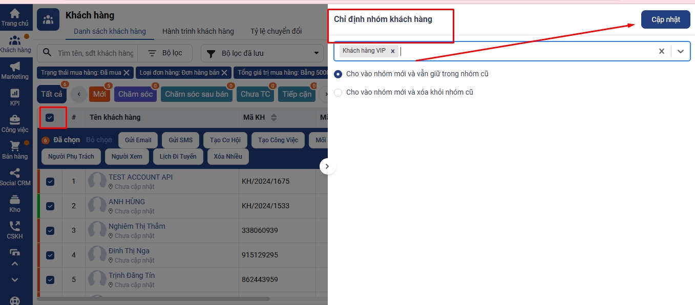 Tích chọn tập khách hàng vừa tìm kiếm được ⇒ chọn thao tác Nhóm khách hàng ⇒ chọn nhóm khách hàng mong muốn (ví dụ: nhóm khách hàng VIP)