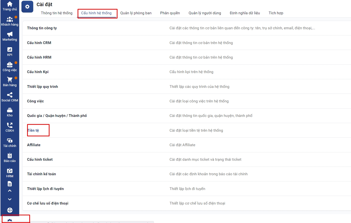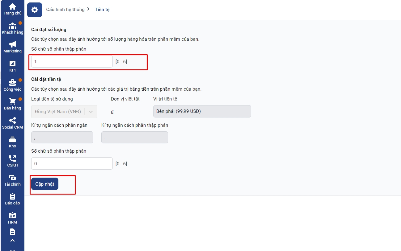 Để cài đặt số lượng chữ số thập phân trong phần số lượng các bạn vào mục cài đặt -> chọn cấu hình hệ thống -> Tiền tệ
