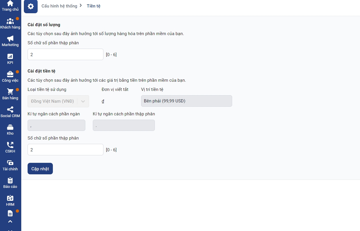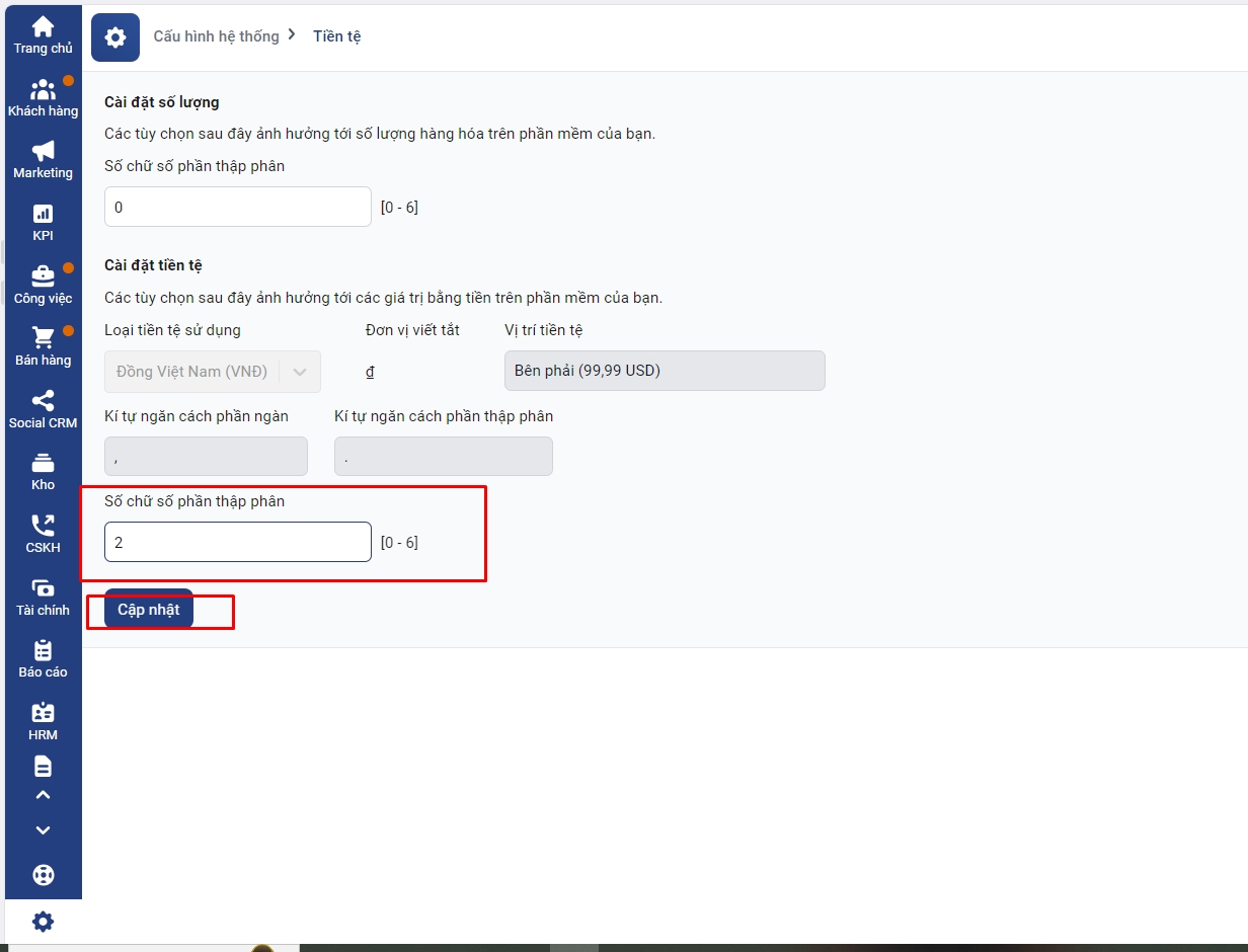 Ví dụ: bạn muốn ghi nhận 2 chữ số thập phân trong ở số tiền ( ví dụ: 5,000,000.03) các bạn điền số 2 ở phần số chữ số ở phần thập phân -> cập nhật