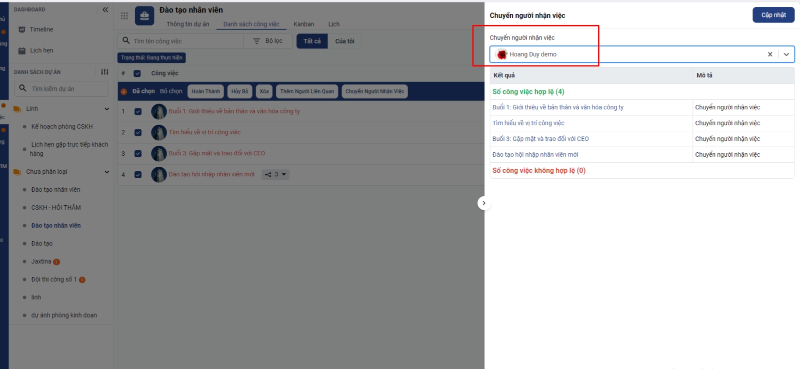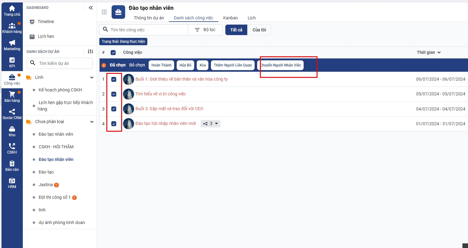 Bước 1: Lọc các công việc do bạn nhân viên 1 là người thực hiện công việc sau đó chuyển toàn bộ người thực hiện công việc sang cho bạn nhân viên kinh doanh 2