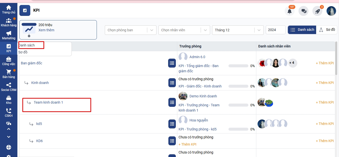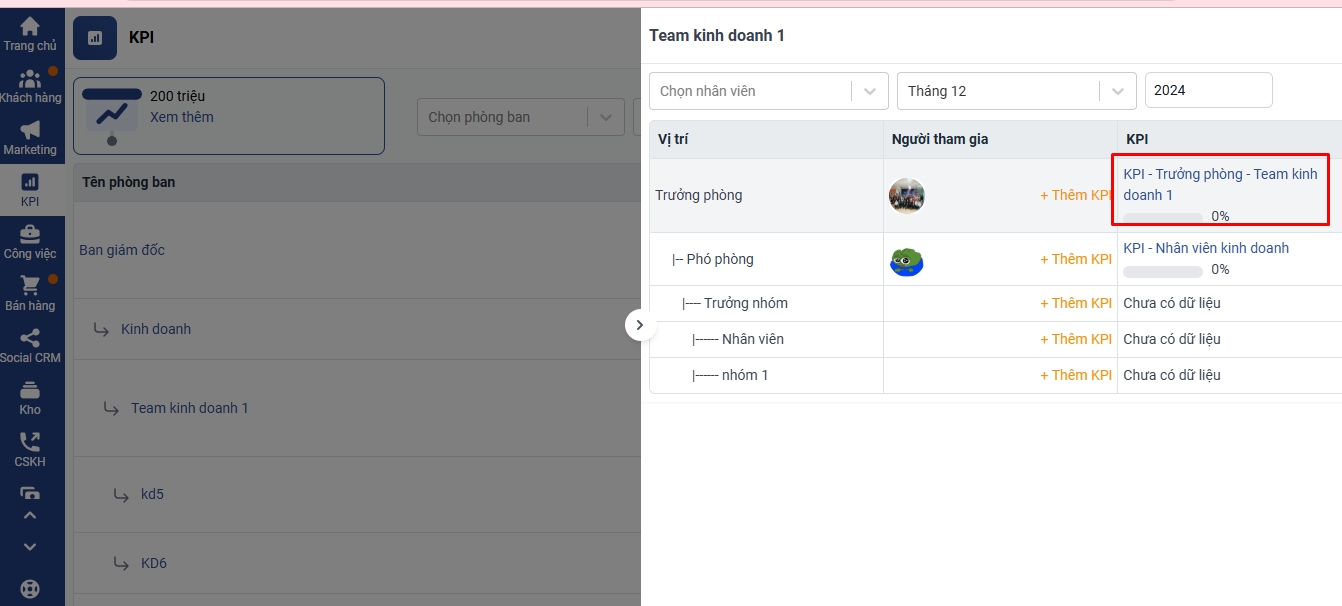 Vào danh sách KPI → Chọn phòng ban có phiếu KPI