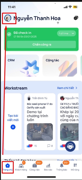 Bạn mở app Getfly ⇒ màn hình Trang chủ ⇒ chọn Vào Avata cá nhân (góc trên cùng phía bên tay trái) ⇒ chọn KPI cá nhân