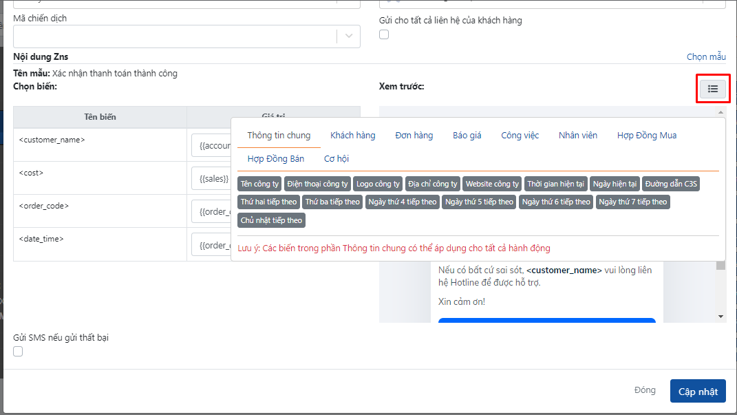 Để chọn các giá trị tương ứng với tên biến, bạn có thể điền mặc định hoặc chọn các biến liên quan đến khách hàng, đơn hàng ở phần danh sách biến như hình bên dưới.