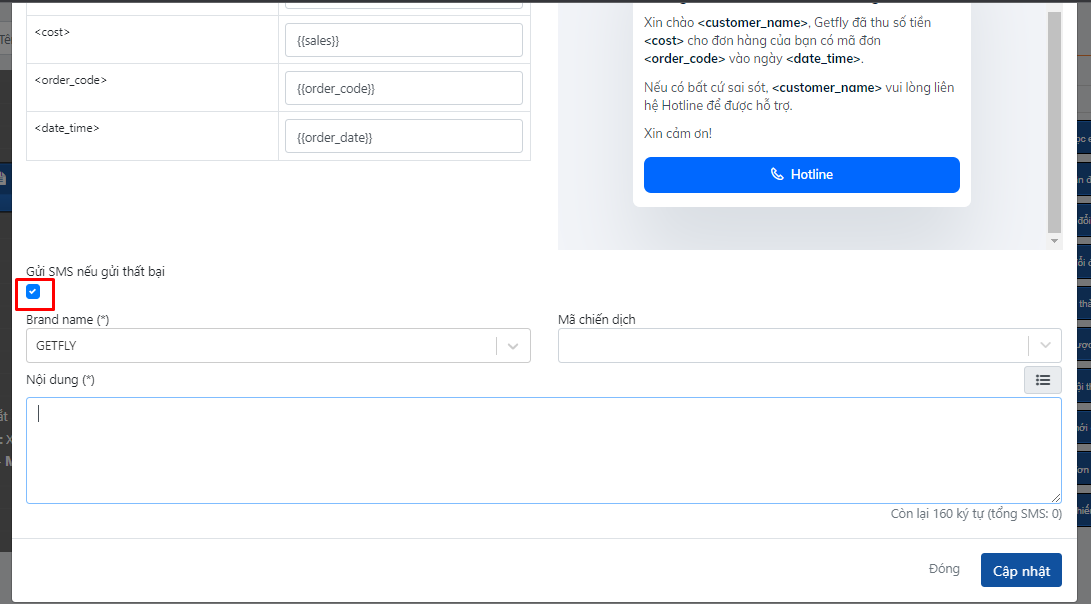 + Hệ quả Gửi SMS cho khách ( Tem SMS cần được đối tác SMS khai báo và duyệt trước khi sử dụng)