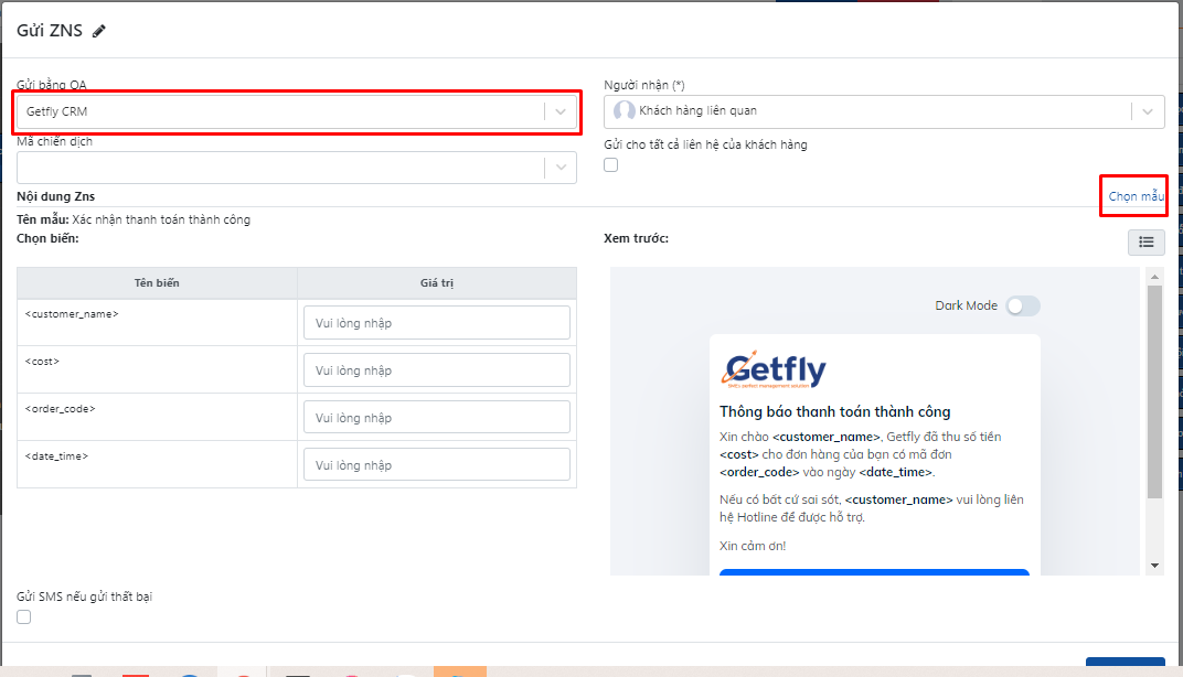 Câu 3. Cách tạo auto gửi ZNS cho khách hàng trên Getfly?