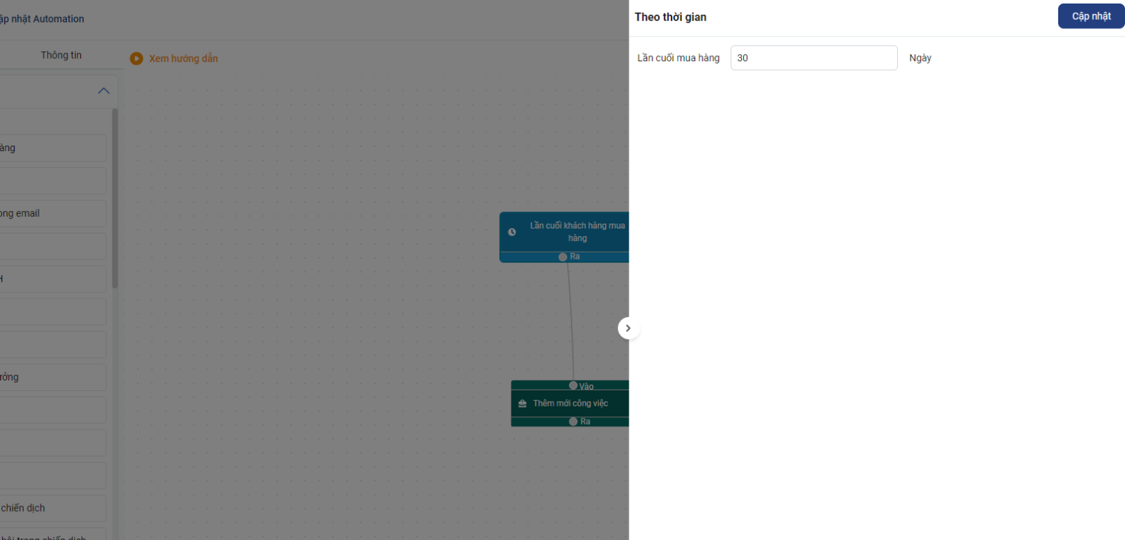 Bước 2: Chọn khối hành động theo thời gian lần cuối mua hàng và hệ quả cập nhật người phụ trách khách hàng