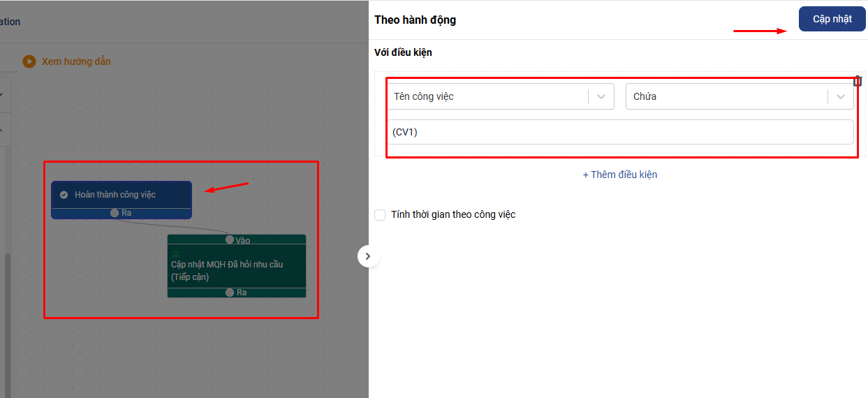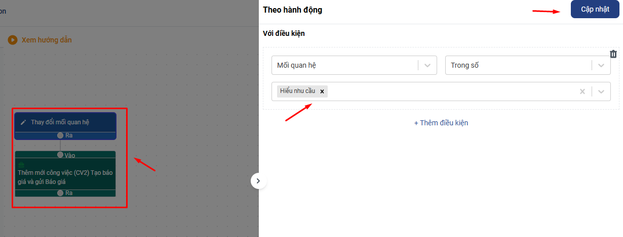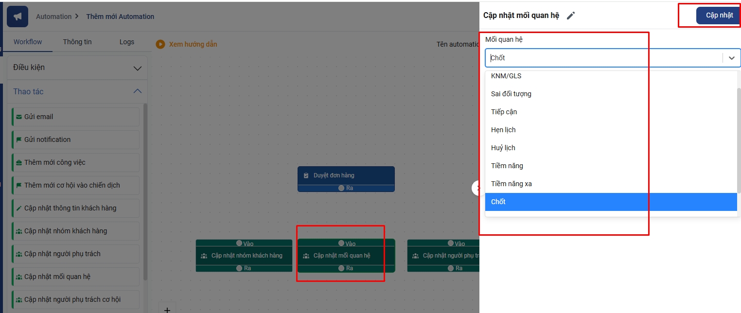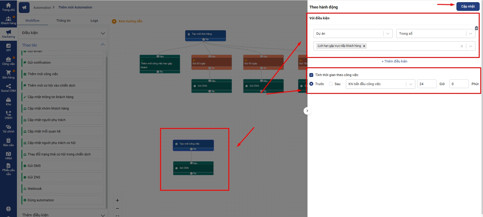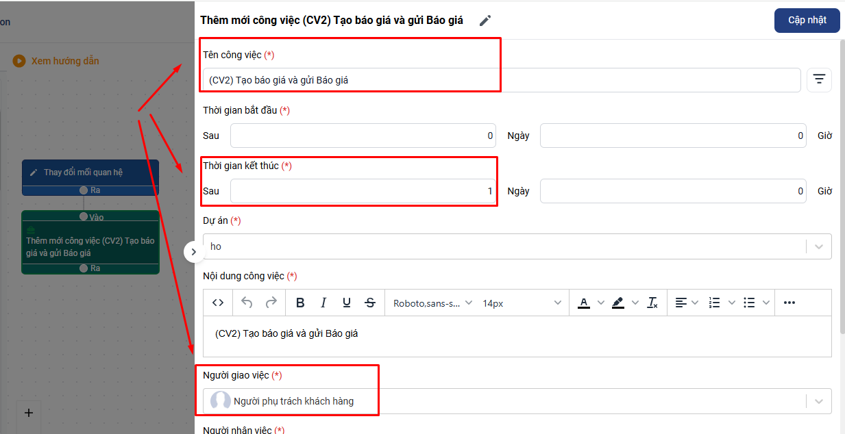 - Automation 1: Hoàn thành (CV1) thì đổi mối quan hệ khách hàng sang Đã hỏi nhu cầu (Tiếp cận) - Automation 2: Khách hàng được đổi sang mối quan hệ (Tiếp cận) thì tạo CV tạo báo giá và gửi Báo giá (CV2) Thời gian 1 ngày sẽ dùng ràng buộc thời gian kết thúc công việc