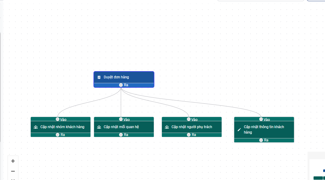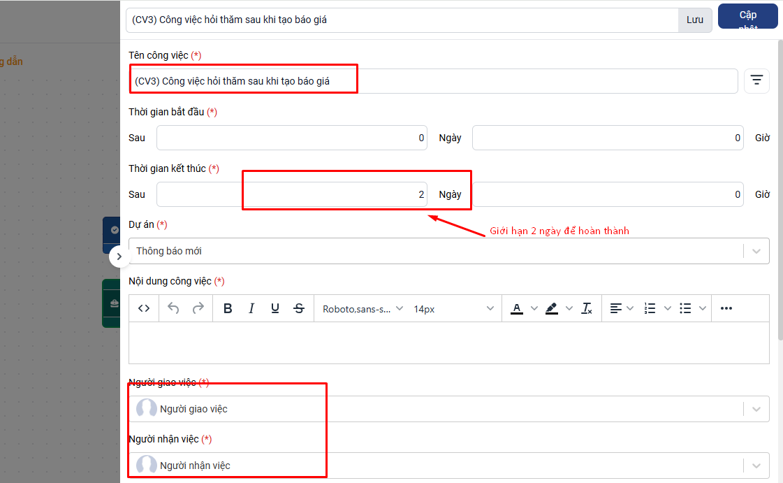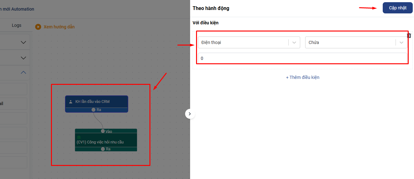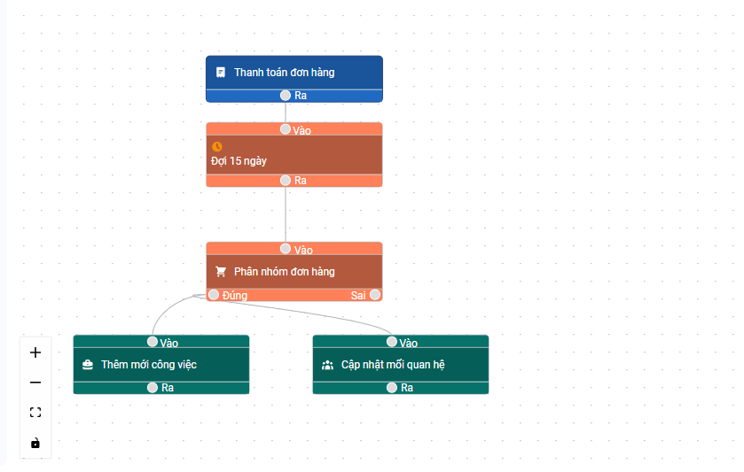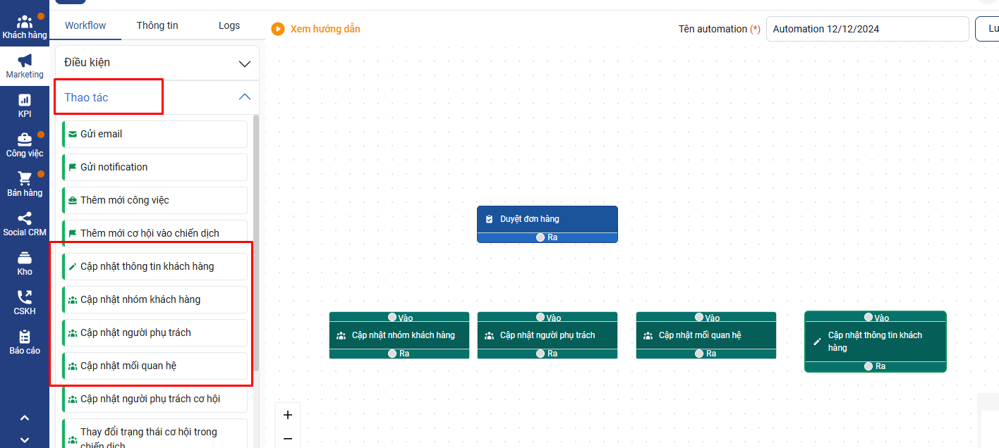 - Automation 1: Hoàn thành (CV1) thì đổi mối quan hệ khách hàng sang Đã hỏi nhu cầu (Tiếp cận) - Automation 2: Khách hàng được đổi sang mối quan hệ (Tiếp cận) thì tạo CV tạo báo giá và gửi Báo giá (CV2) Thời gian 1 ngày sẽ dùng ràng buộc thời gian kết thúc công việc