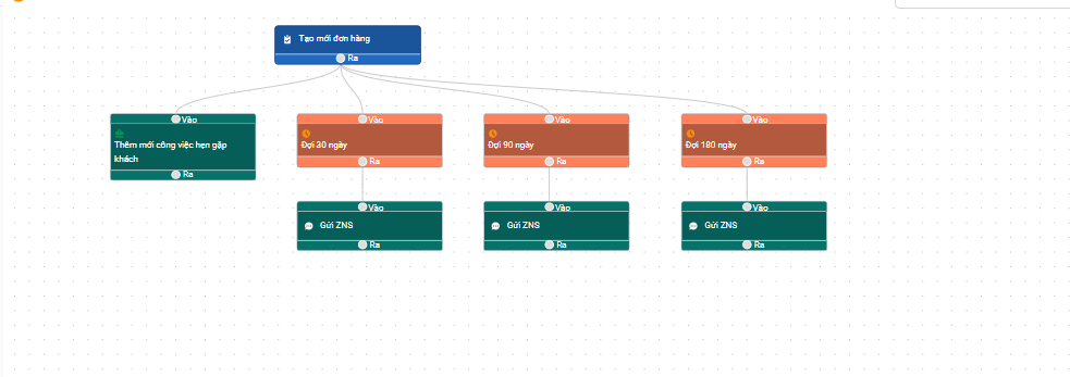 Trường hợp muốn chạy lại quy trình automation, bạn có thể tạo 1 chiến dịch hoặc mối quan hệ Chăm sóc - upsale cho khách hàng cũ vào để tiện theo dõi và chăm sóc lại khách hàng.