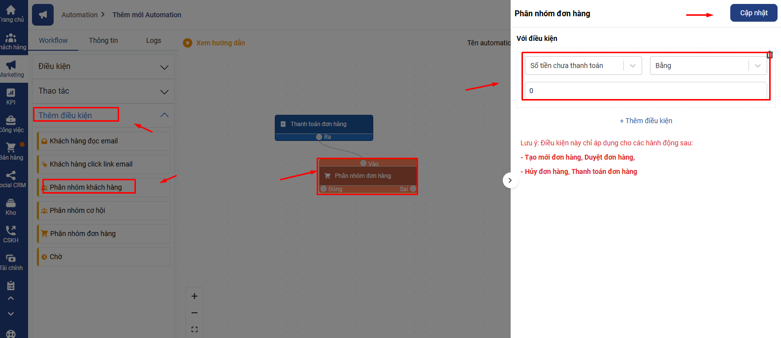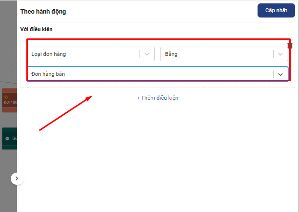 Ngoài ra bạn có thể ràng buộc thêm các điều kiện khác với đơn hàng áp dụng Automation bằng cách click vào mục Thêm điều kiên