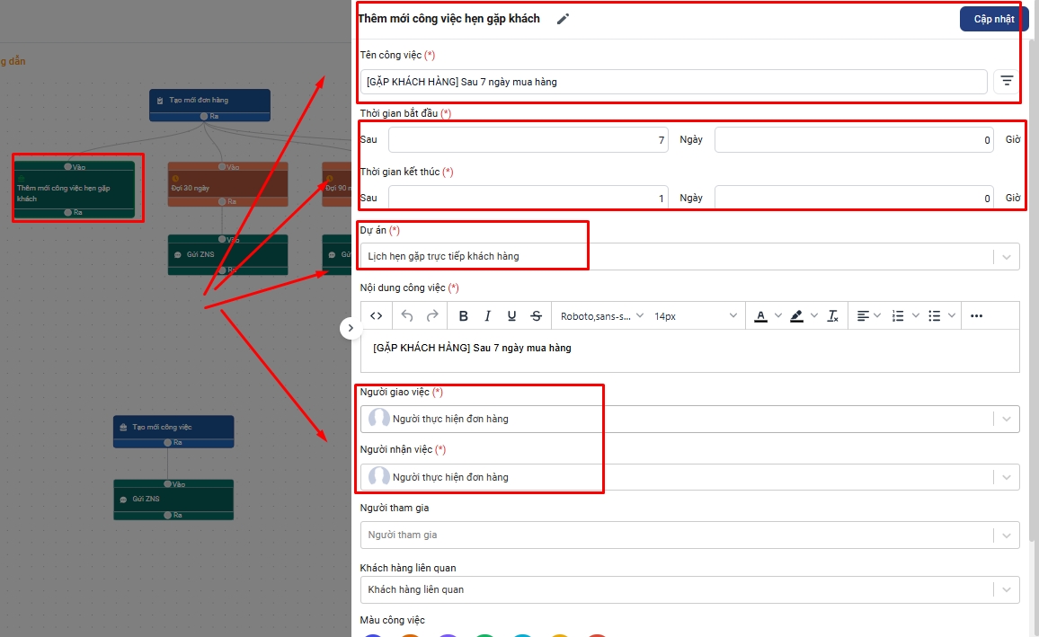 8. Hỏi thăm khách hàng sau khi giao hàng thành công - Tạo automation: Hoàn thành (CV6) thì tạo Công việc hỏi thăm khách hàng sau khi mua hàng (CV7) Thời gian 2 ngày sẽ dùng ràng buộc thời gian kết thúc công việc