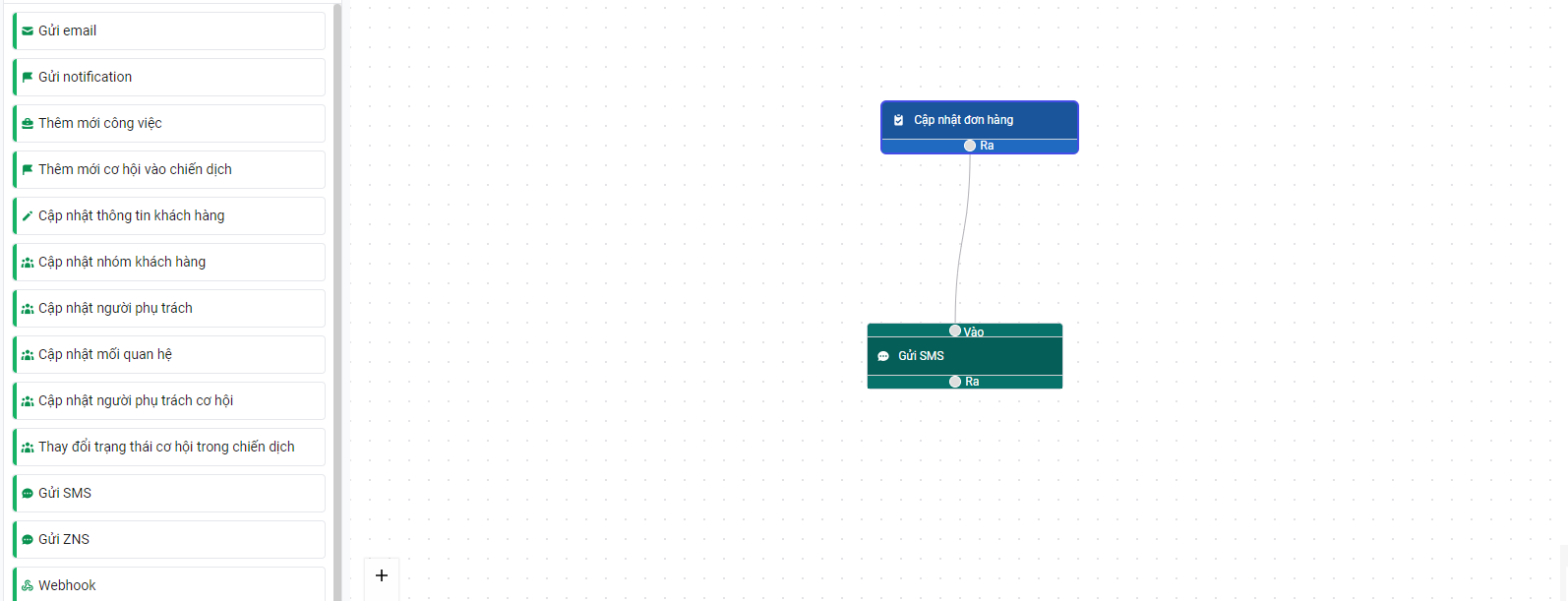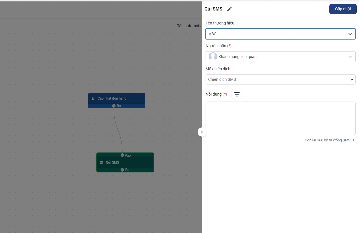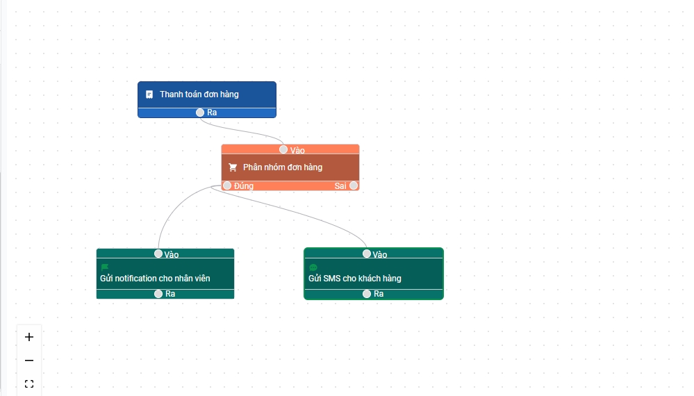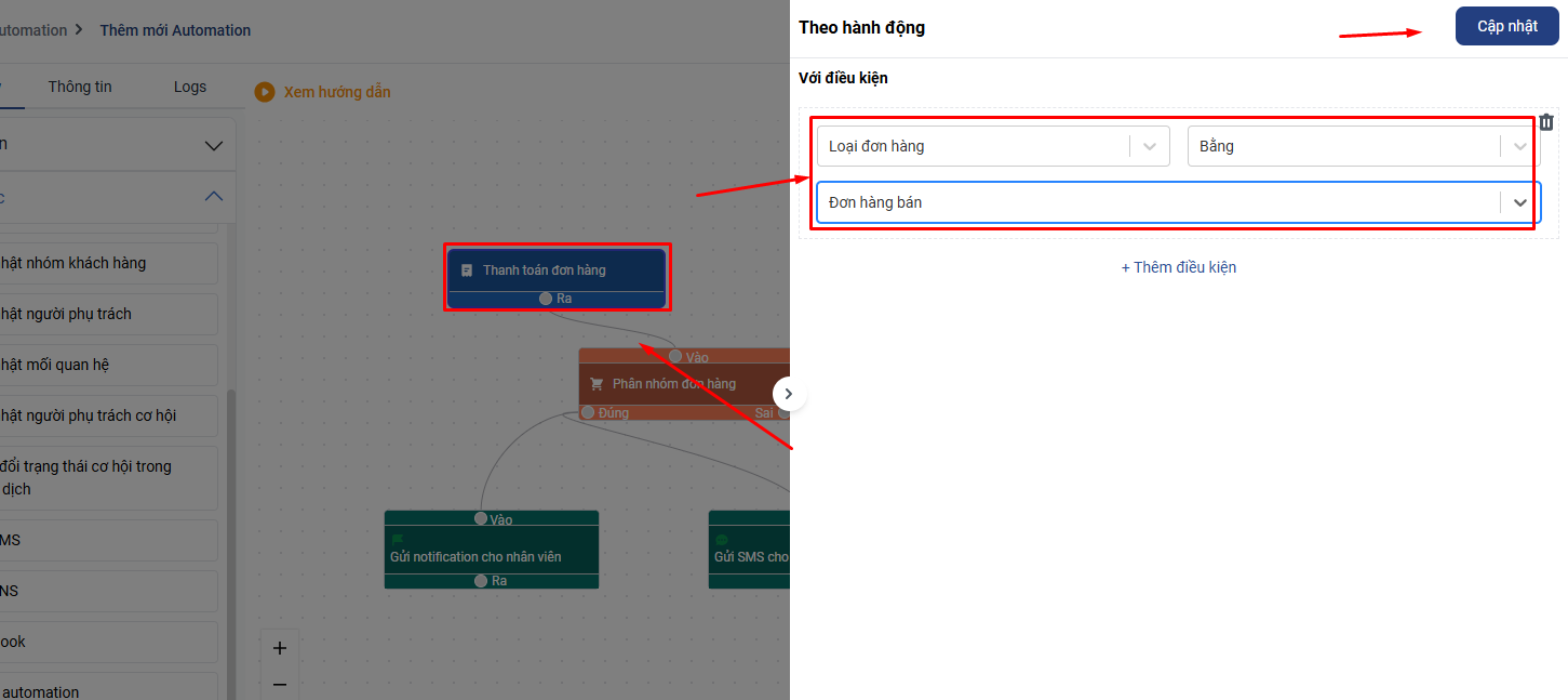 Nối ra của điều kiện cập nhật đơn hàng với vào của thao tác gửi sms: