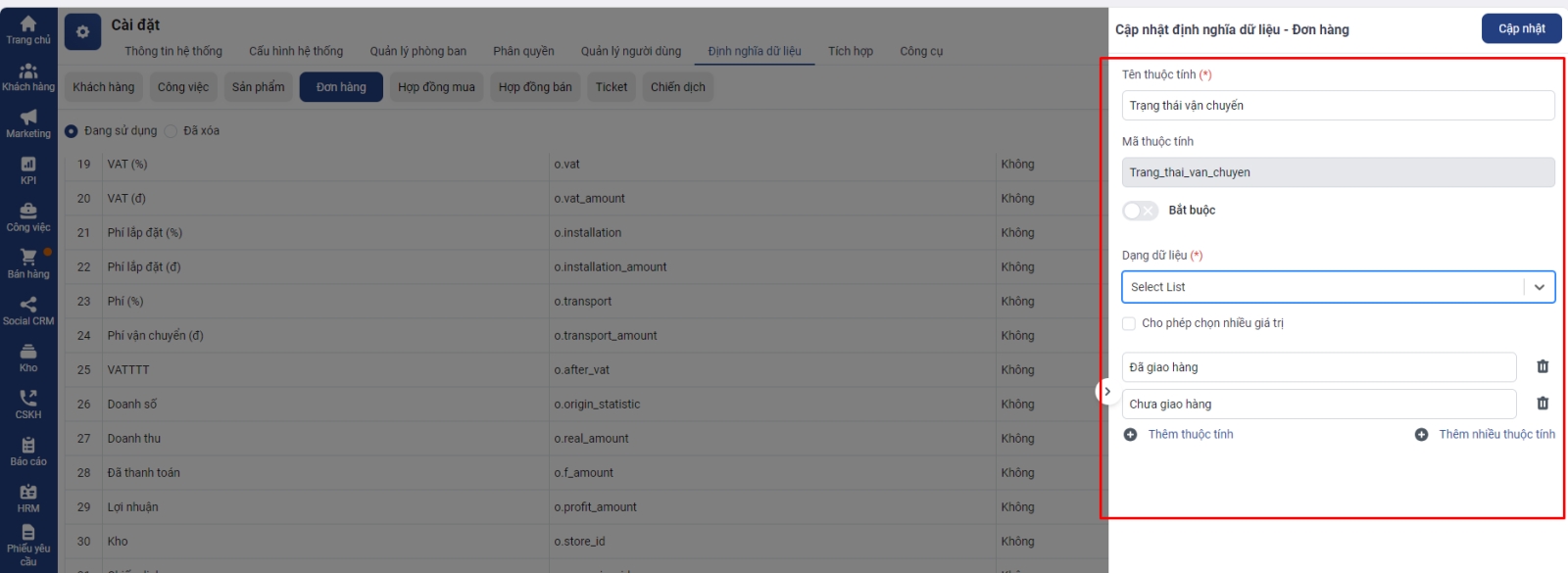 Bạn vào mục cài đặt -> định nghĩa dữ liệu -> đơn hàng -> thêm mới 1 trường dữ liệu là trạng thái vận chuyển -> chọn dạng dữ liệu là select list -> tạo lựa chọn đã giao hàng và chưa giao hàng.