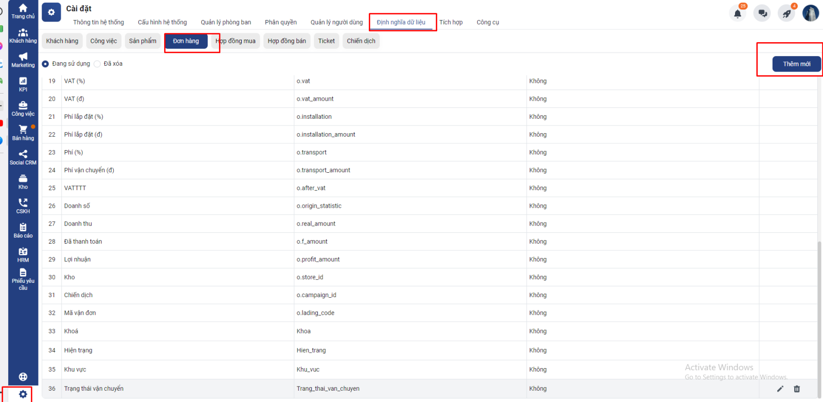 Cài đặt → Định nghĩa dữ liệu → Đơn hàng → Thêm mới