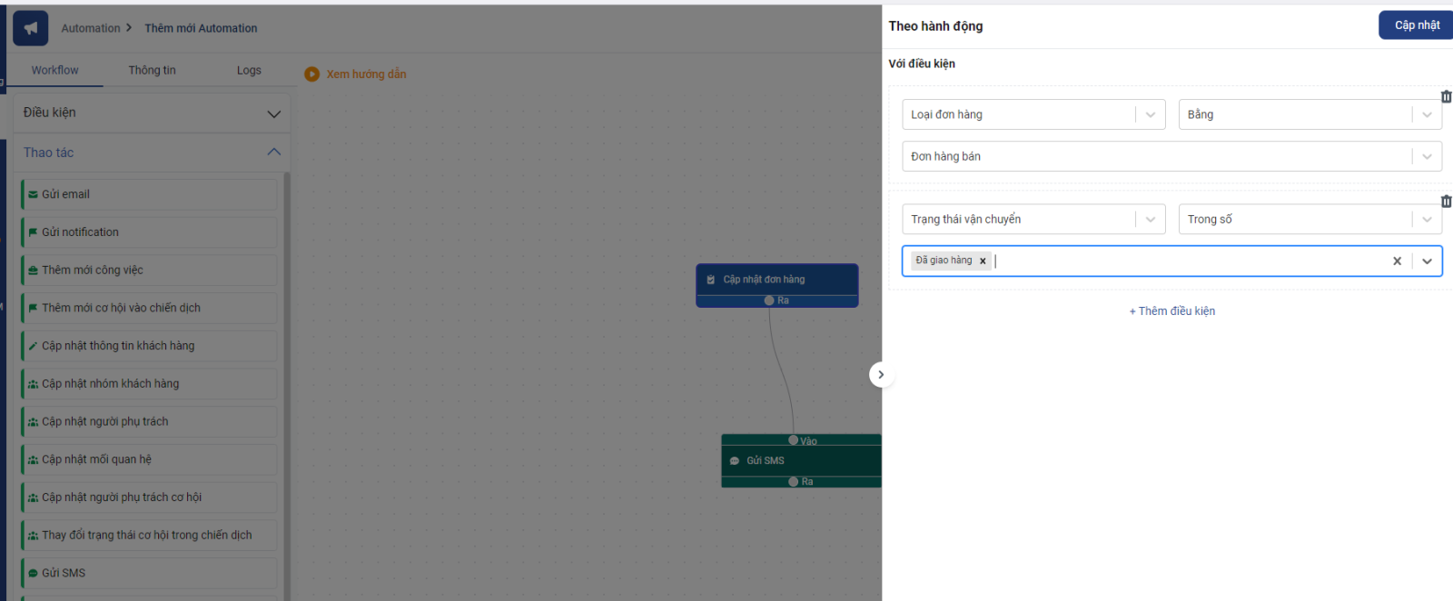 Bước 3: Chọn khối điều kiện cập nhật đơn hàng và thao tác gửi sms ( hoặc gửi email, Zns tùy thuộc vào nhu cầu của bạn muốn gửi thông báo với khách hàng dưới dạng sms hay email, Zns)