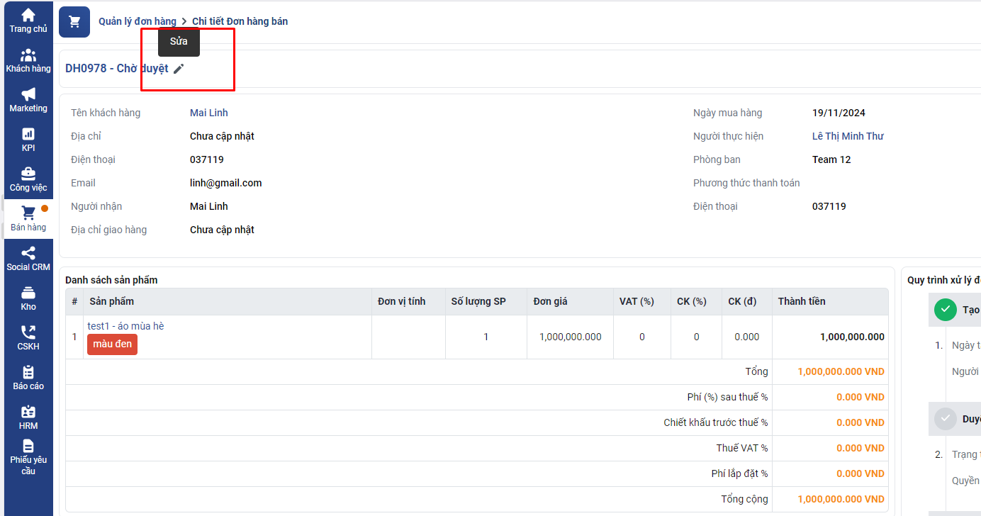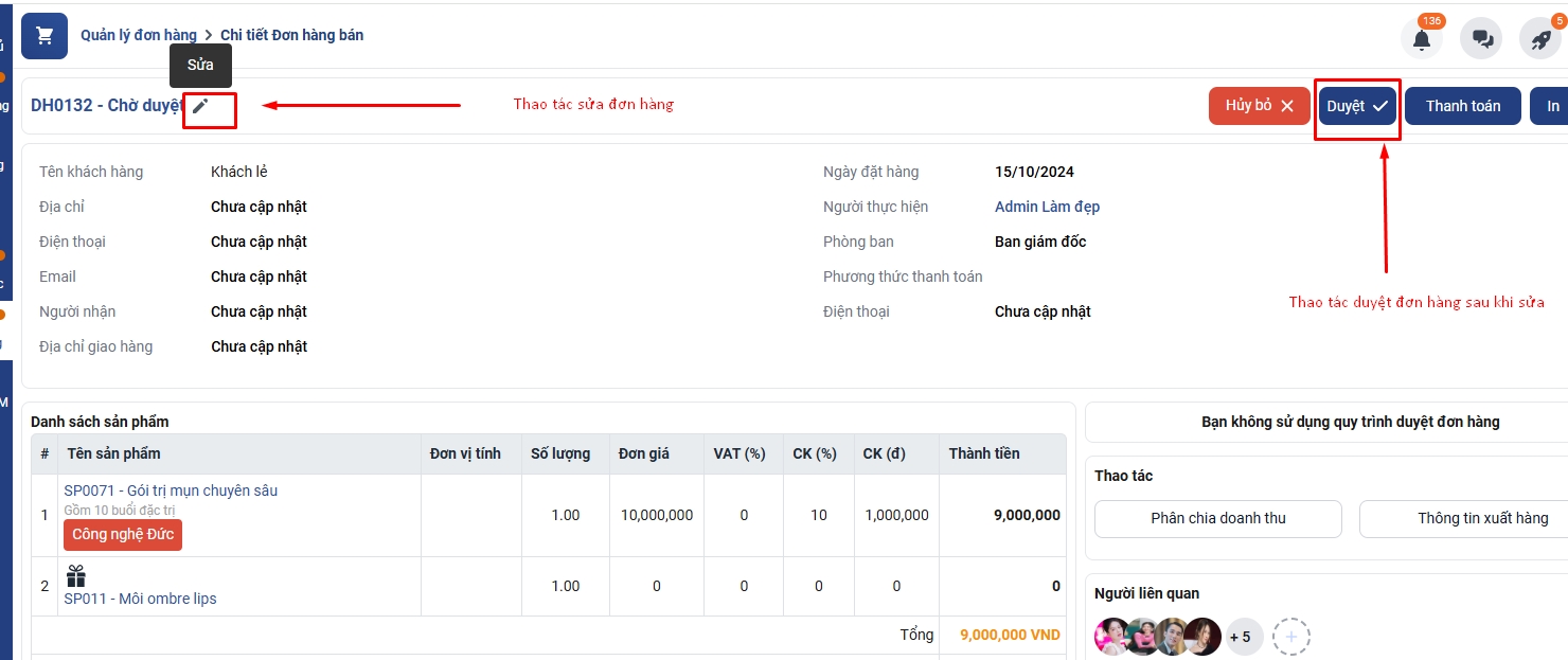 Sau khi tạo và kích hoạt automation theo hướng dẫn trên thì Sau khi nhân viên thao tác sửa đơn hàng cần bấm duyệt đơn hàng để hệ thống chạy theo kịch bản automtion đã cài đặt